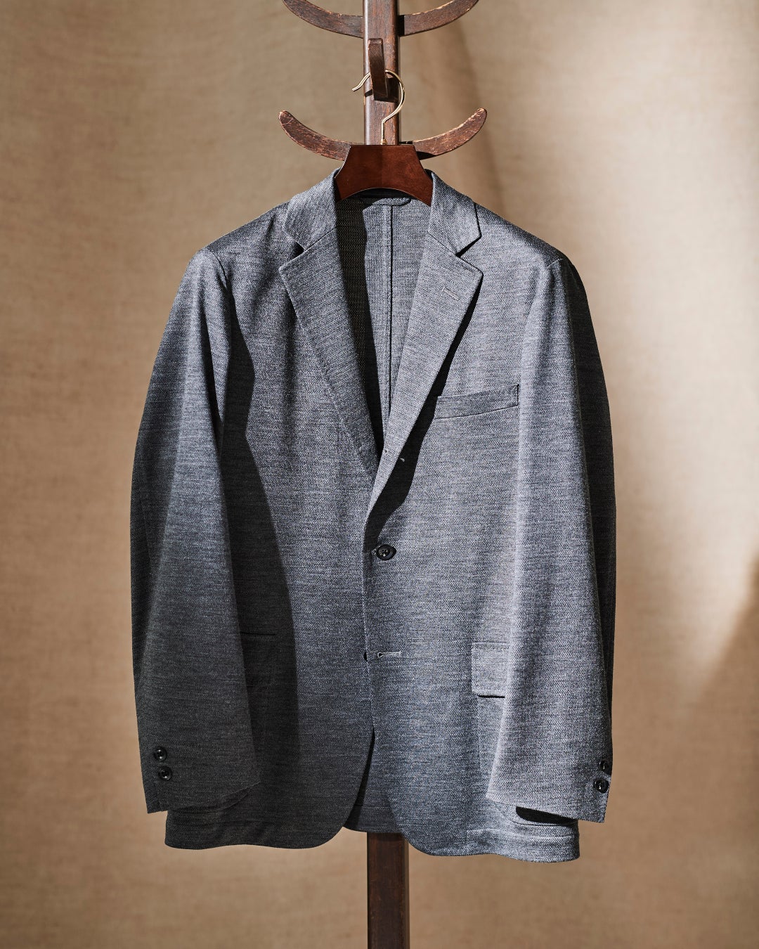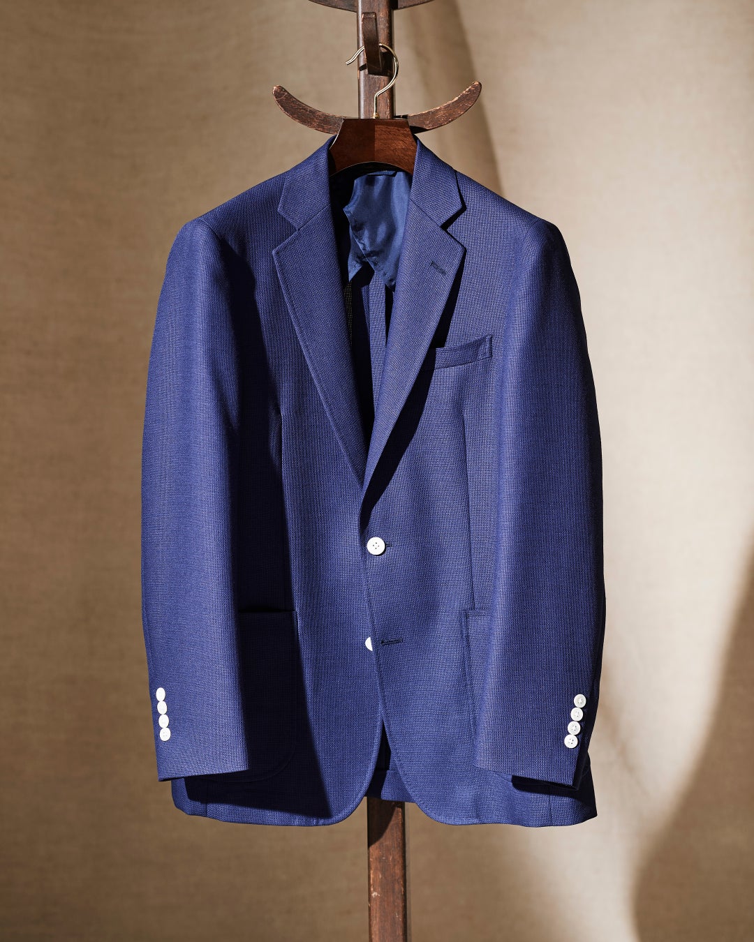 春夏のエレガンスを象徴するウールモヘア素材。華やかな光沢が軽装にも品格を演出します。こちらは日本が誇る毛織物の名産地・尾州のファブリックメーカー「ICHITEKI」が手がけたホップサック織り。程よいスポーティ感も演出でき、タイドアップからカットソーまで幅広いインナーにマッチします。白蝶貝のボタンも夏らしい涼感を引き出すポイントに。