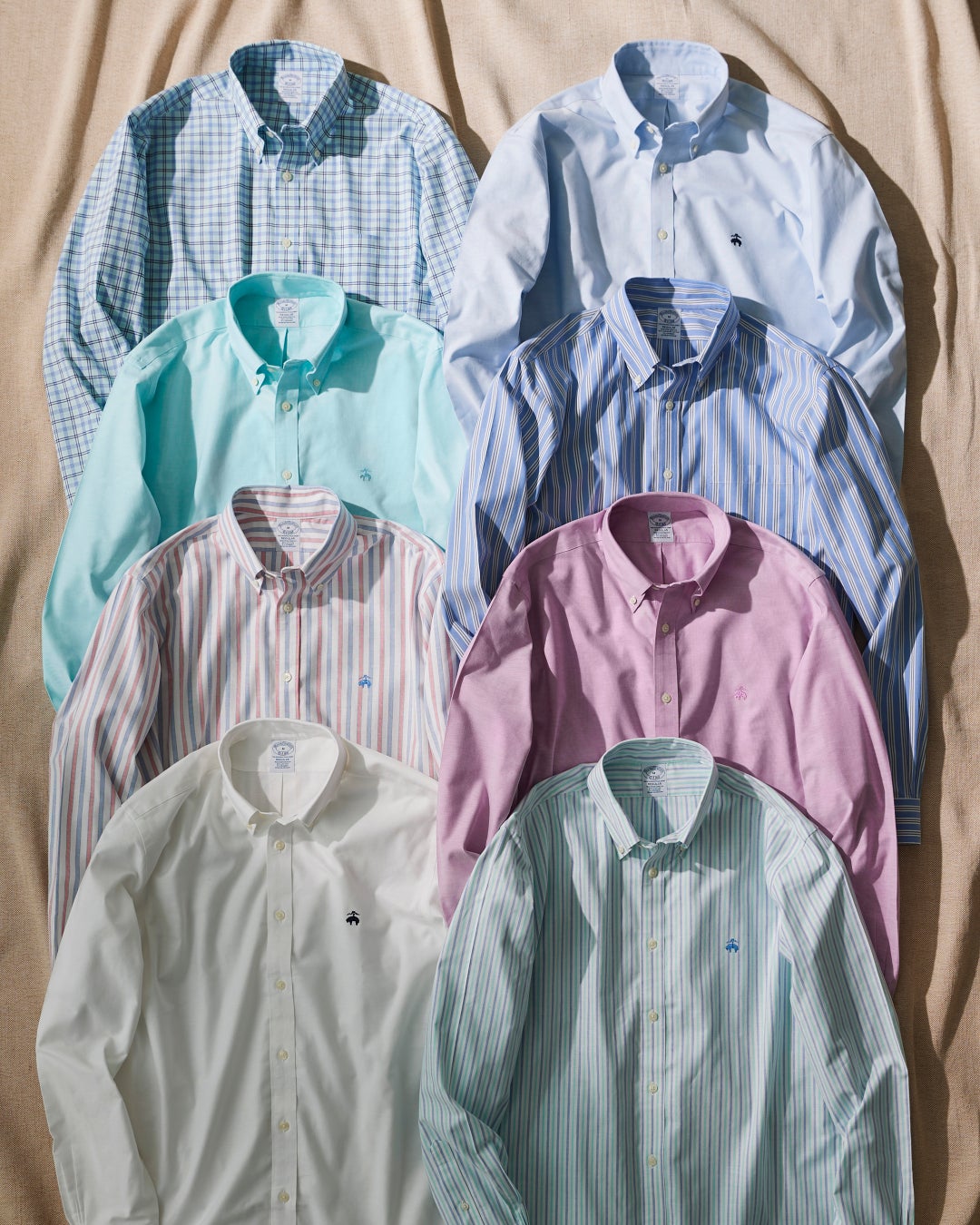 ベーシックなドレスシャツに加え、色とりどりのカジュアルシャツもご用意。こちらもすべてノンアイロン仕様で、洗いざらしのまま着用できます。今季旬のパステルカラー、遊び心の利いたマルチストライプ、スポーティなチェックシャツと、幅広い表情が並ぶのもポイント。胸元には、生地の色柄に合わせたゴールデン フリースの刺繍をあしらっています。