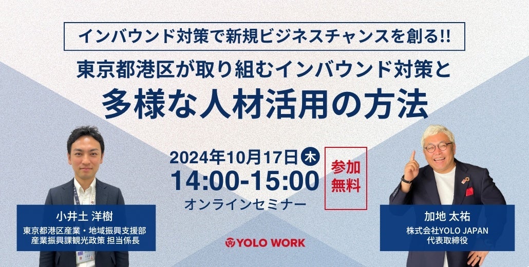 【10/17(木) 開催!】「東京都港区が取り組むインバウンド対策と多様な人材活用の方法」無料ウェビナー|港区産業・地域振興支援部とYOLO JAPAN共催
