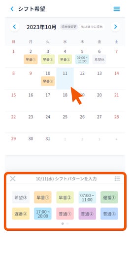 ※「編集」ボタンを押して希望休を提出する形式から、直接カレンダーの日付をタップし希望休・希望シフトパターンを入力できる仕様に変更になりました。