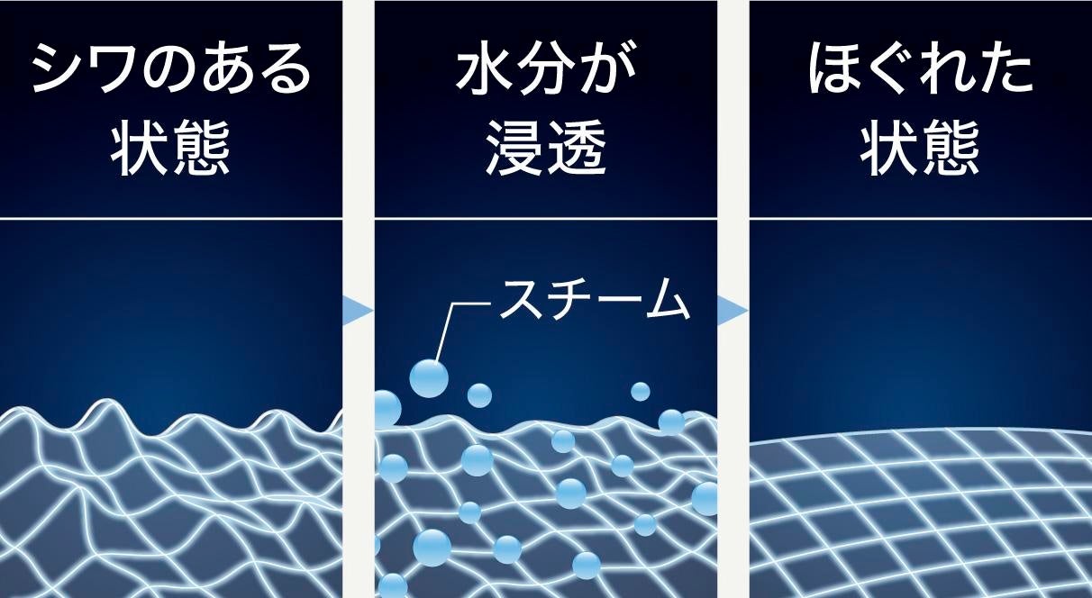 衣類のシワの原因は、絡みついたまま乾燥した繊維。衣類スチーマーは、絡みついたまま乾燥した繊維に水分を与えて「ほぐす」ことでシワを伸ばします。シワ伸ばしのポイントは繊維の奥までしっかり水分を浸透させること。スチーム量が多いほど浸透効果は高まり、スチームが繊維の奥までしっかり浸透し、繊維がほぐれシワが伸びやすくなります。