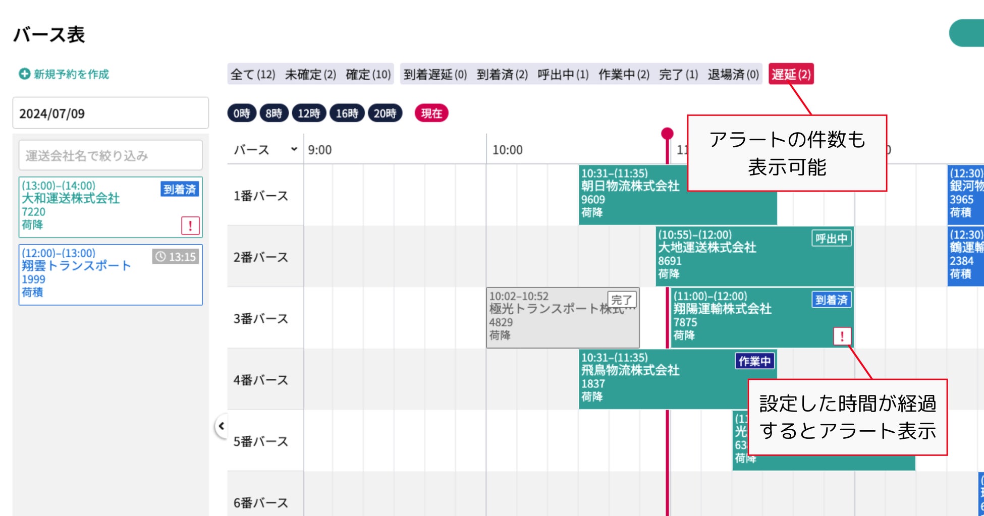 この度のアップデートにより、アラートの件数が表示されるようになりました。これにより、長時間の荷待ちとなりそうな車両について、物流センターの荷役担当者がいち早く把握できるようになります。作業当日に荷待ちにつながる課題に気づき、対応することで荷待ち時間の短縮をすることが可能です。