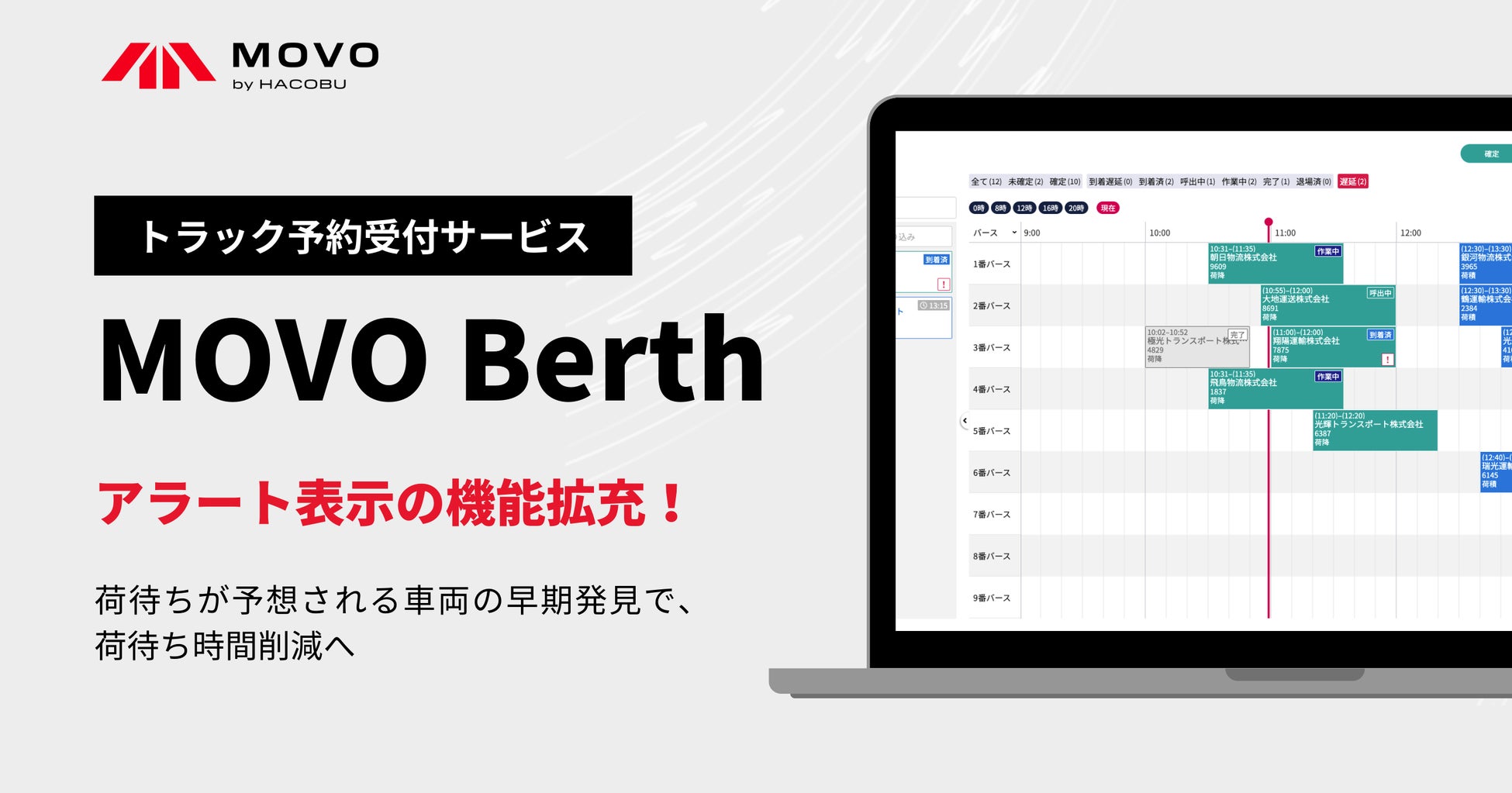 データの力で物流課題を解決する株式会社Hacobu(ハコブ、本社:東京都港区、代表取締役社長 CEO 佐々木太郎、以下「Hacobu」)は、トラック予約受付サービス「MOVO Berth(ムーボ・バース)」のアラート表示の機能拡充をいたしました。