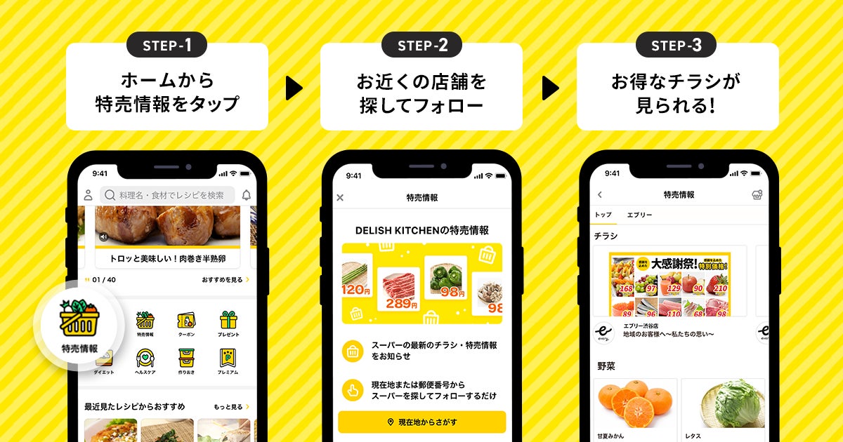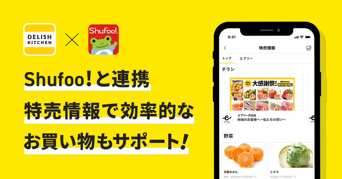 株式会社エブリー(本社:東京都港区、代表取締役:吉田 大成)が運営する「DELISH KITCHEN(デリッシュキッチン)」アプリおよびWebサイト上で、凸版印刷株式会社のグループ会社である株式会社ONE COMPATH(本社:東京都港区、代表取締役社長CEO:早川 礼、以下ONE COMPATH)が運営する「Shufoo!(シュフー)」のチラシ情報が見られるようになり、近くのスーパーの特売情報と合わせてレシピを検索することができるようになりました。今後も両社のノウハウをいかし、より効率的な買い物体験をお届けしてまいります。