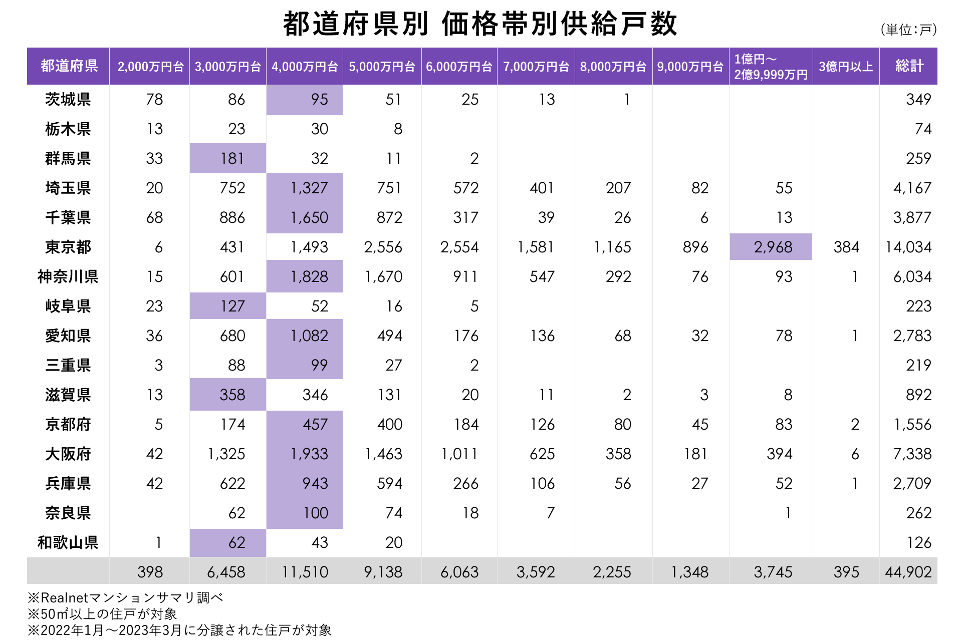 東京都は、価格帯が5,000万円台、6,000万円台が主流で、他の都府県よりも1段高い価格帯が主流になっていますが、1億円以上3億円未満の住戸が3,000戸弱供給されており、他の都道府県とは一線を画す高値相場を形成していることが大きな特徴と言えます。