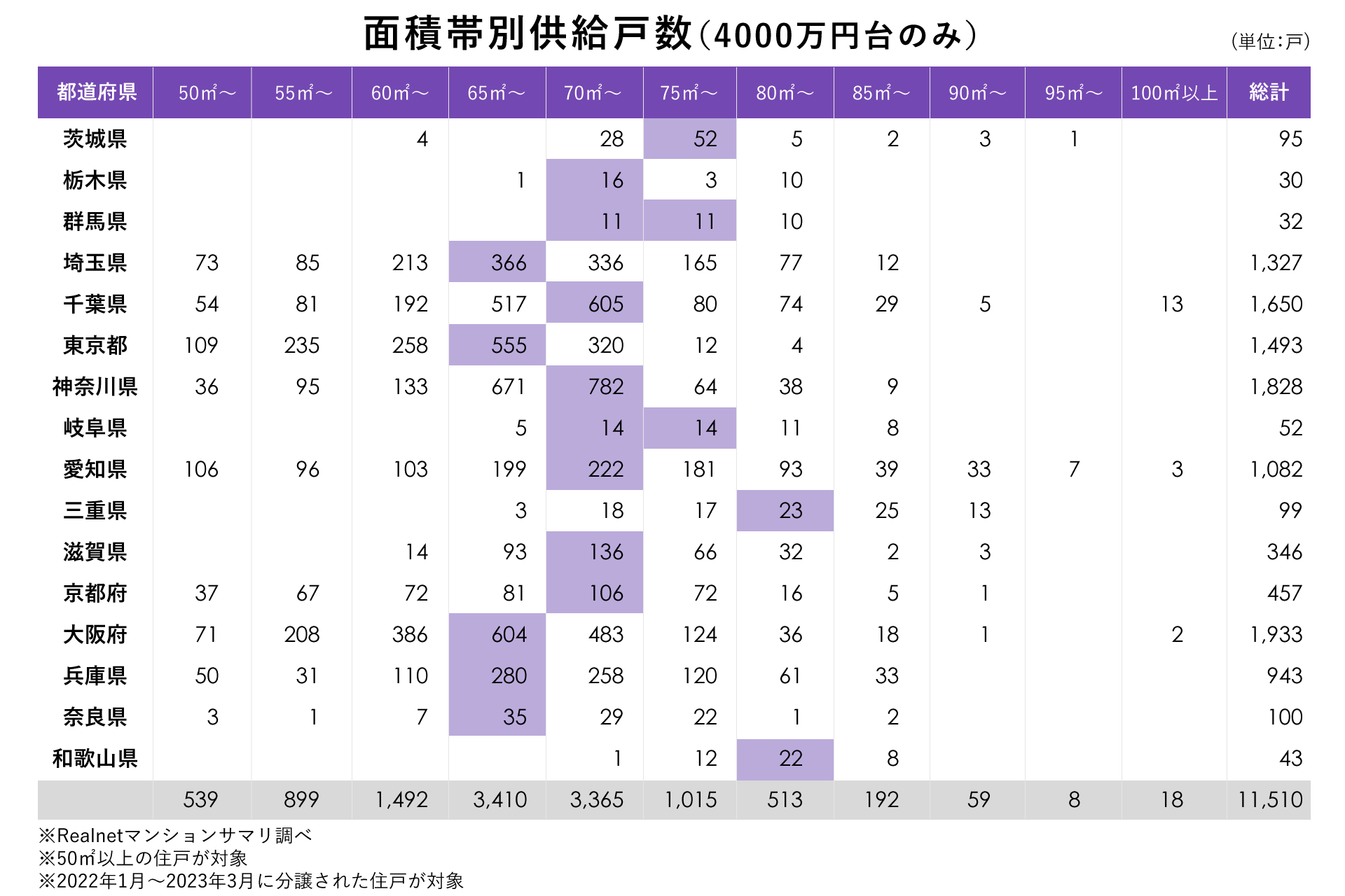 次に、大多数の都府県で一番多く供給された価格帯の4,000万円台に限定して、どの程度の広さの住戸が供給されていたのか注目しました。上記の面積帯別供給戸数(4,000万円台のみ)の表を見ると、埼玉県、東京都、大阪府、兵庫県、奈良県でも65㎡以上、それ以外でも主力供給面積は70㎡以上であることが分かります。