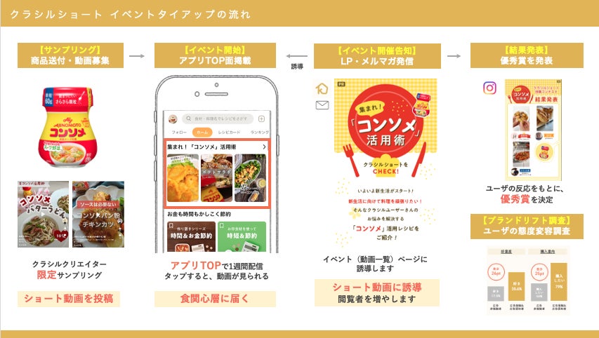 「クラシルショート イベントタイアップ」は、「クラシル」のweb・アプリでショート動画を発信しているクリエイターに商品サンプリングを行い、テーマに沿ったレシピのショート動画の投稿を促し、投稿された動画を「クラシル」に掲載します。