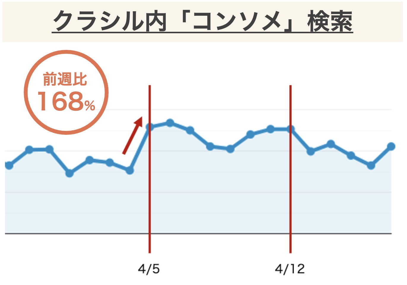 「クラシル」において「コンソメ」検索数が前週比で168%となり、ユーザーの検索行動にも変化