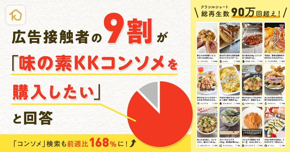 「クラシル」が提供する新広告メニュー「クラシルショート イベントタイアップ」で「味の素KK コンソメ」がプロモーションを実施し、広告接触者の9割が購入したいとポジティブな回答