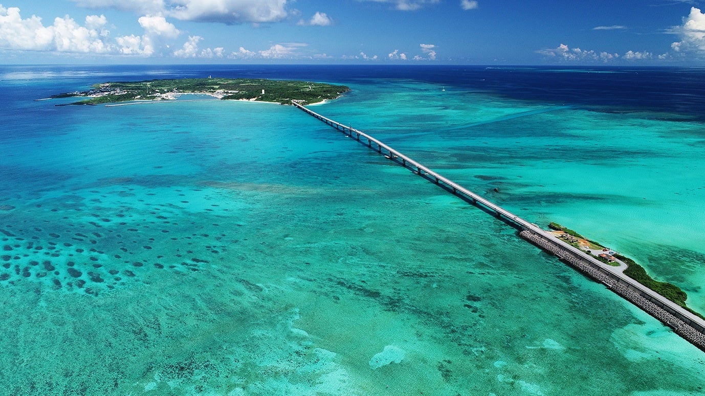 宮古島市は沖縄本島から南西に約300kmに位置し、大小6つの島で構成されています。宮古島はサンゴ礁の隆起によりできた島で、平坦な地形で山がなく、水はけの良いサンゴの地層のため雨水はすぐに地下に浸透し、地下水として海に流れています。サンゴが自然に破砕されてできた真っ白な砂浜は、「宮古ブルー」と讃えられる宮古島の海の碧さを際立たせています。