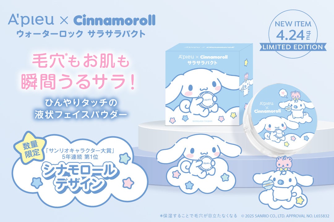 株式会社ミシャジャパン(所在地:東京都港区)が展開する、韓国コスメブランド「A’pieu(アピュー)」は、皮脂吸着とテカリ防止効果を叶えるクッションタイプのフェイスパウダー「アピュー ウォーターロック サラサラパクト」から、株式会社サンリオのキャラクター「シナモロール」デザインを2025年4月24日(木)より、全国のバラエティショップ、GMS、ドラッグストア等で数量限定にて販売いたします。サンリオキャラクター大賞 5年連続第1位の大人気キャラクター「シナモロール」がサラサラパクトを抱きかかえているオリジナルデザインです。(一部お取り扱いのない店舗もございます。)