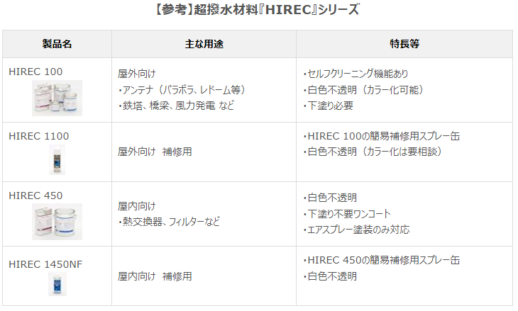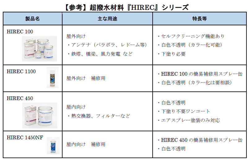 『HIREC 300-W』は、揮発性有機化合物(VOC)をほとんど含まないため、人と環境にやさしく、引火点がないため輸送や保管が容易となります。特に、海外への輸送コストの大幅削減を図ることができます。また、水による希釈が可能でシンナーは不要です。さらに、現在提供中の『HIREC 100』と同等のセルフクリーニング機能を有しており、屋外でも約3年間の超撥水性能維持・着氷雪防止を実現します。