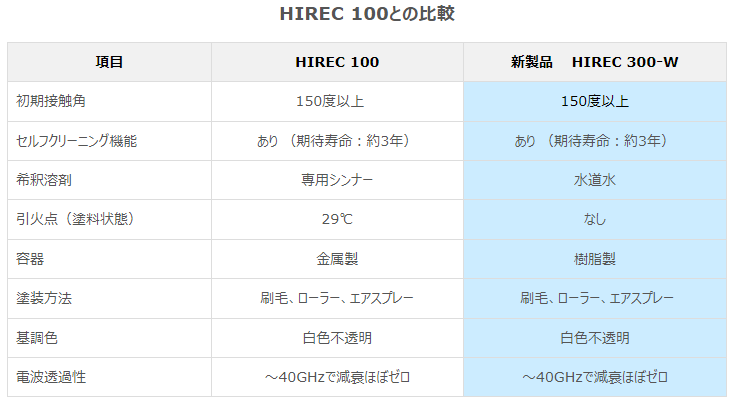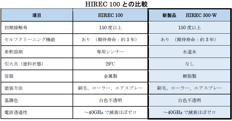 そこで今回、『HIREC 100』と同等の超撥水性能を維持しつつ、これらの制約を受けないよう、VOCを限りなく減らした水系の『HIREC 300-W』を開発し、提供を開始しました。