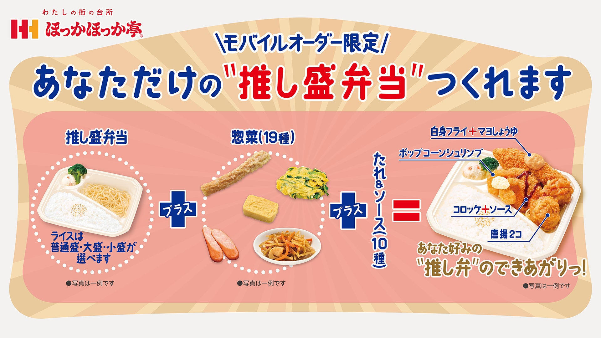 ごはんの量を選択し、19種類の好きな惣菜を好きなだけ※チョイス。最後に、ご希望の味付けに合わせてたれやソースを選んで完成する “自分だけの唯一無二のお弁当” をつくることができる、ほっかほっか亭のモバイルオーダー限定サービスです。