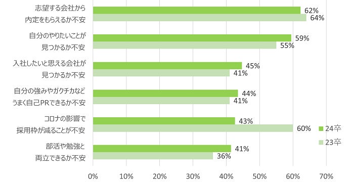 約64%の学生が【志望する会社から内定がもらえるか不安】と答えた。23卒では全体の60%が回答した【コロナの影響で採用枠が減ることが不安】という項目について、24卒では43%に減少している。