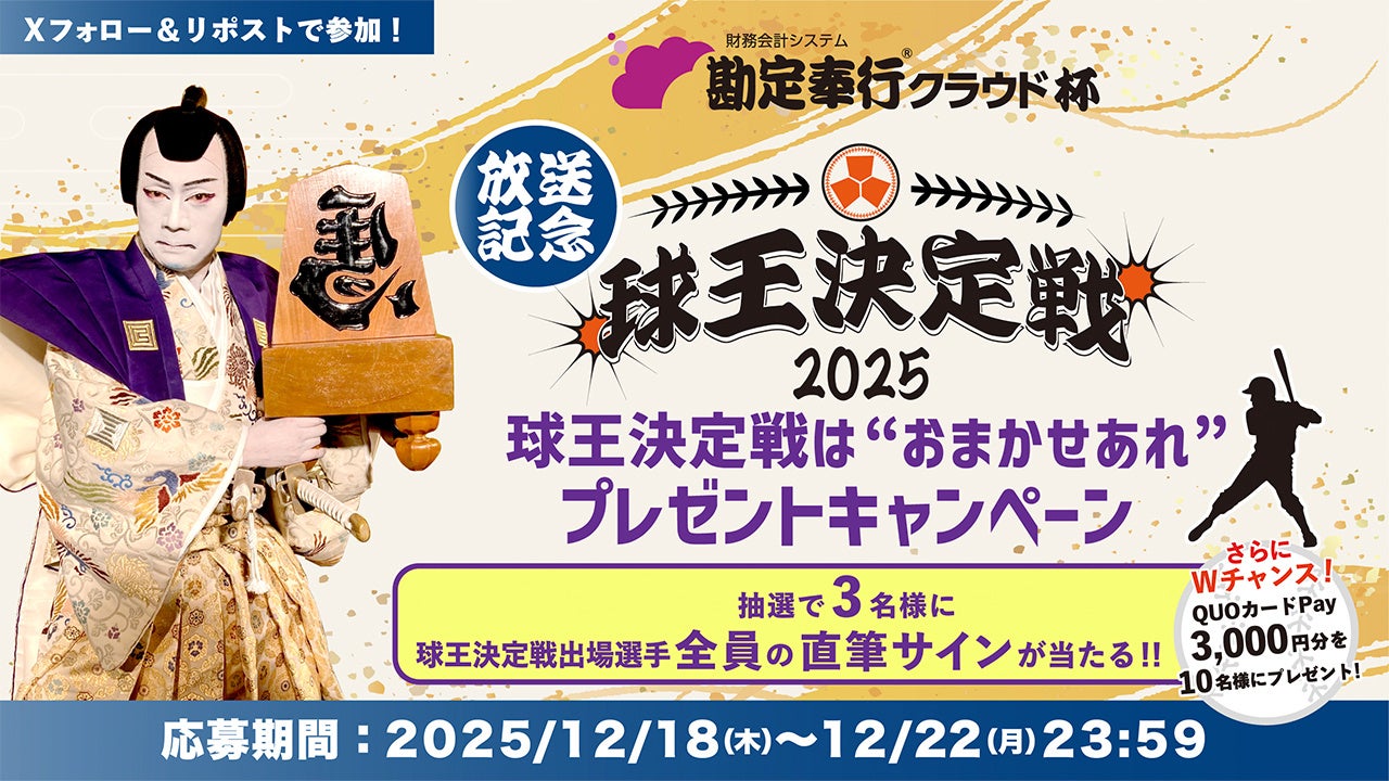 『勘定奉行クラウド杯 球王決定戦』の開催・放送を記念して、OBC公式Xで「球王決定戦は❝おまかせあれ❞プレゼントキャンペーン」を12月18日から開始いたします。