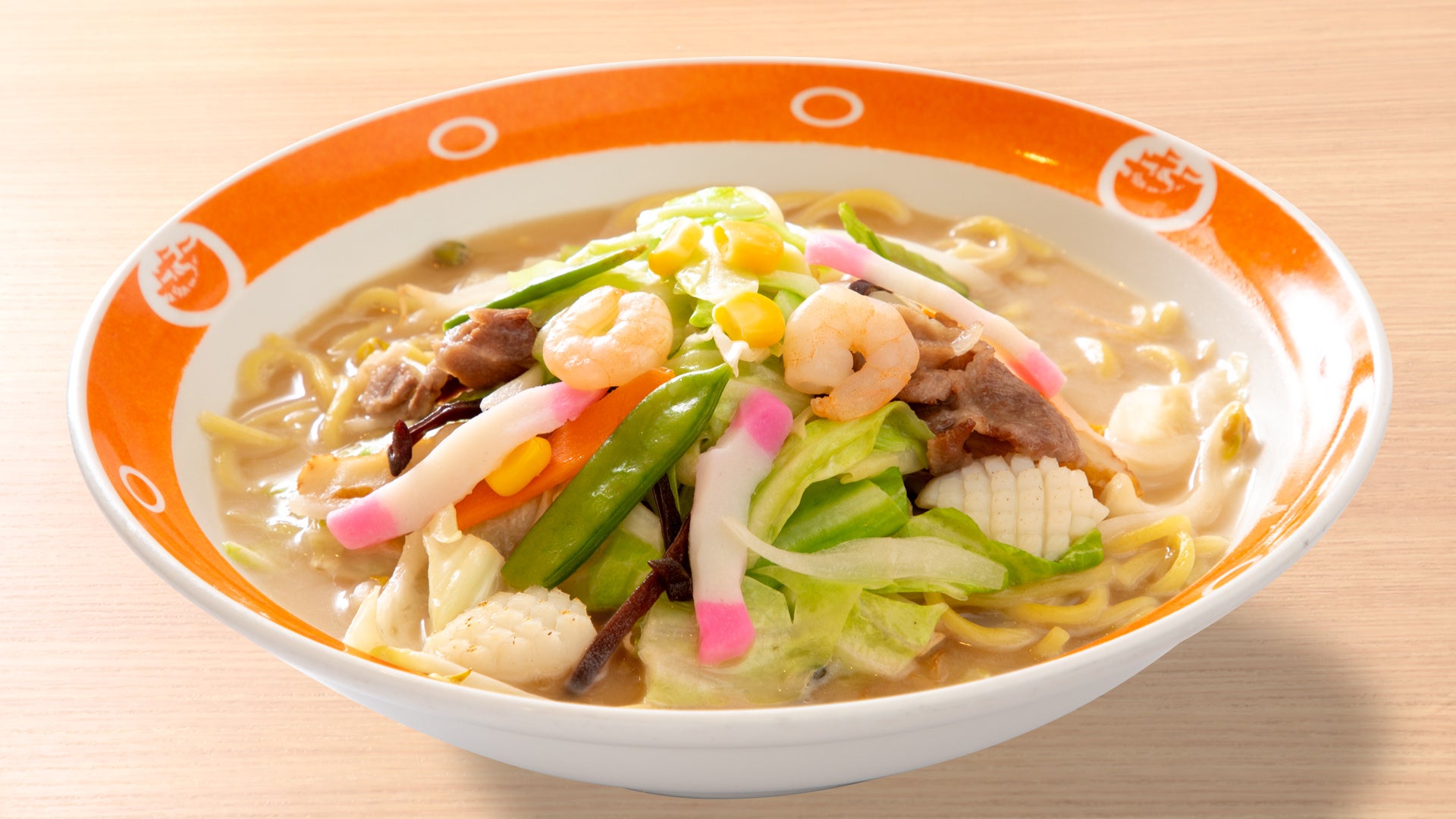 ーメン】の良い部分を活かした特徴にあります。ちゃんぽん特有の具だくさんの食材と白湯スープに