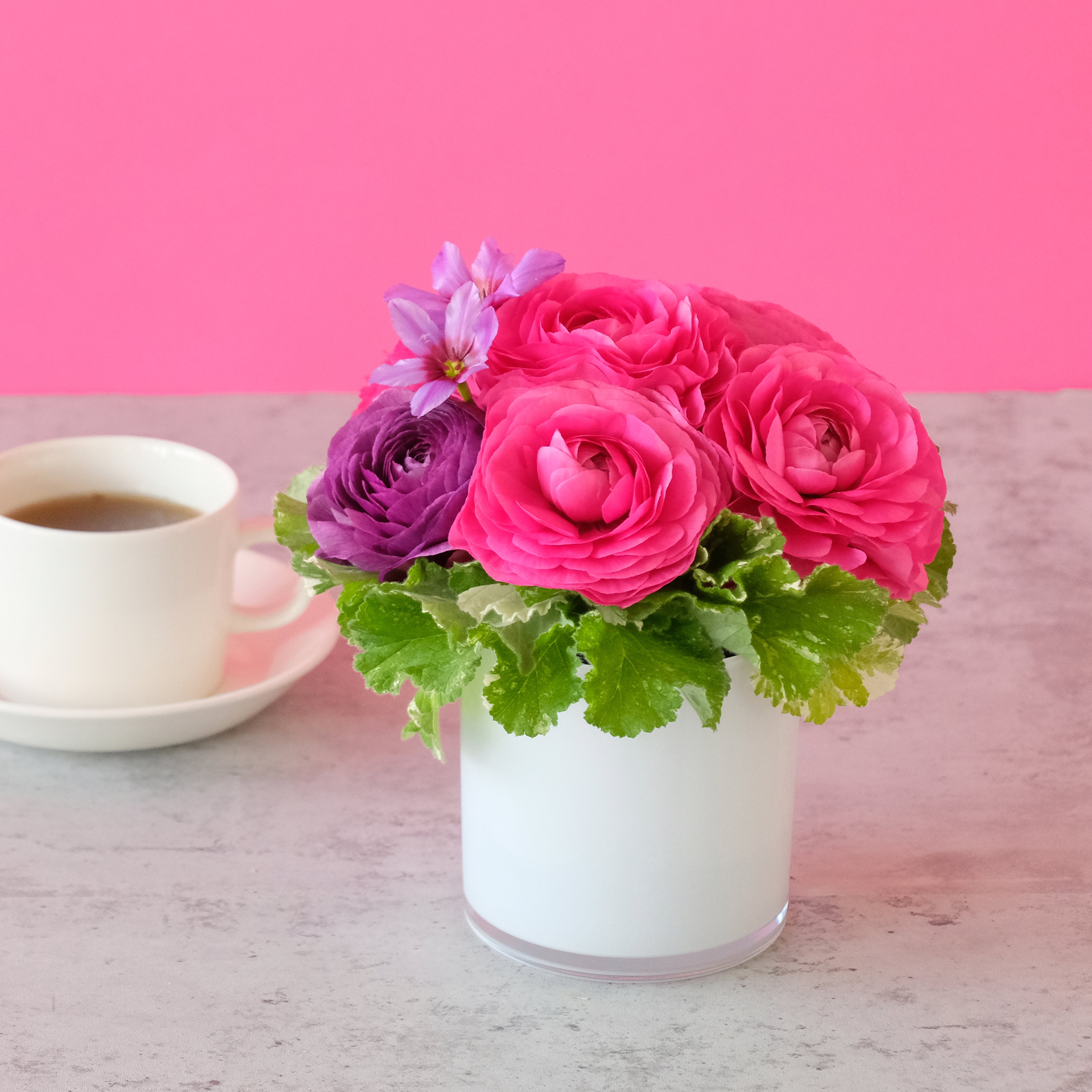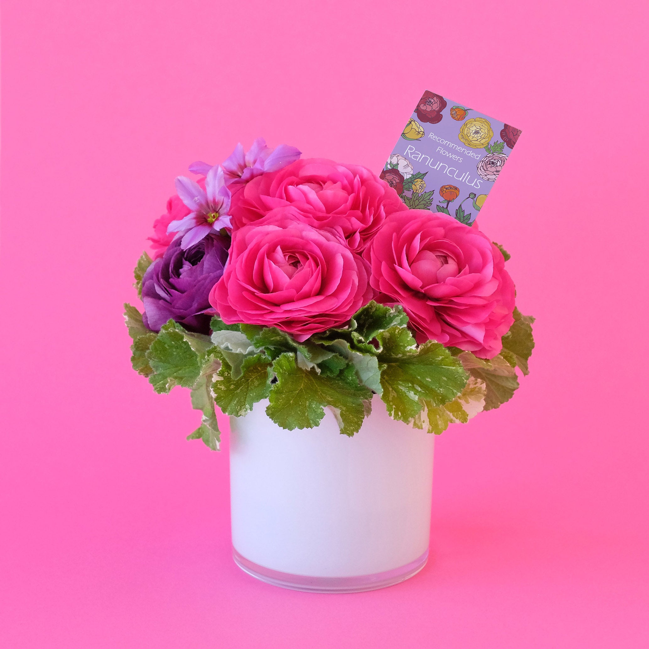 ショップおすすめのラナンキュラスをぎゅっと詰め込んだアレンジメント。ギフトやご自宅用にもおすすめです。器付きのためそのまま飾って楽しめます。