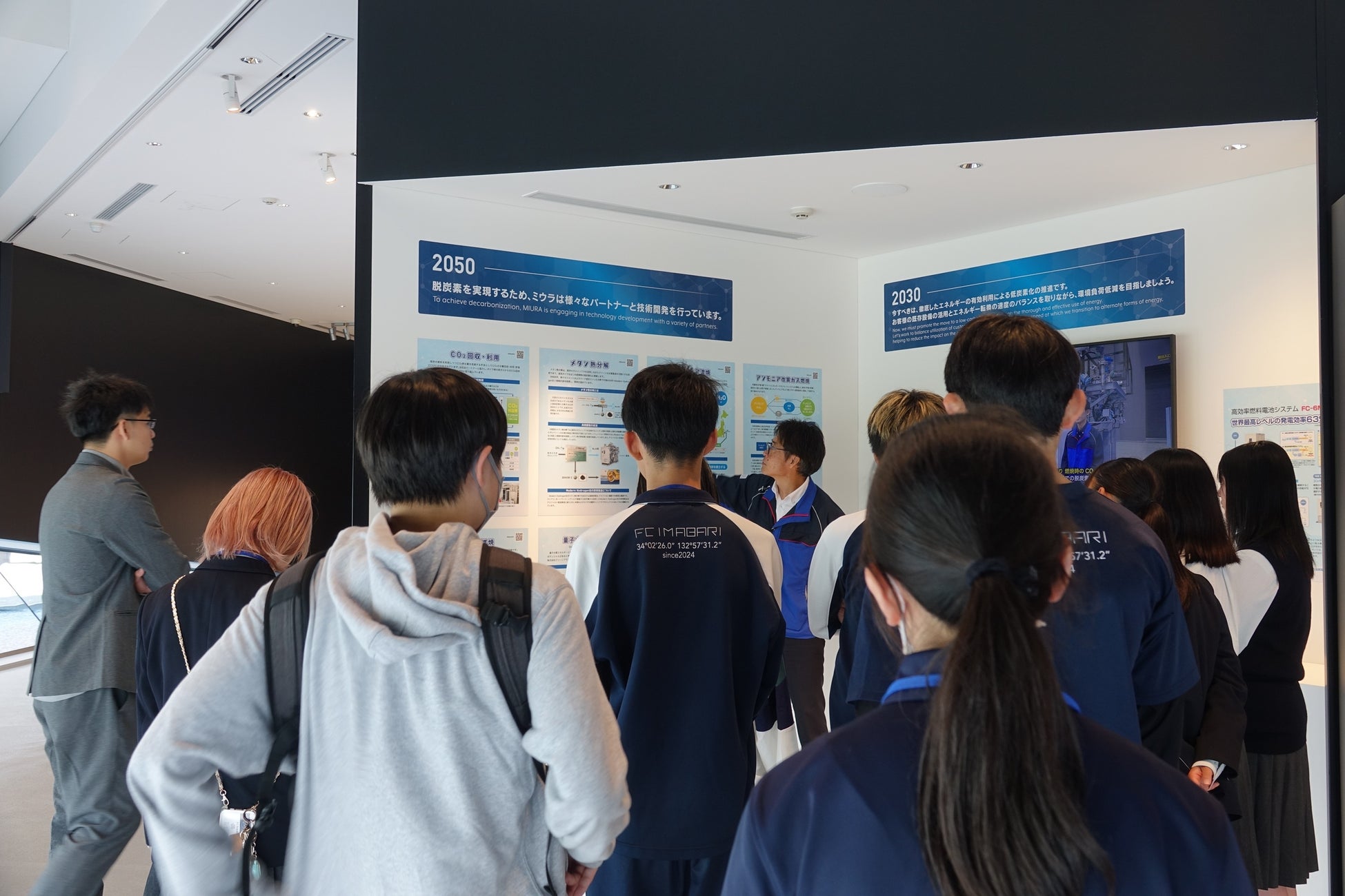 三浦工業株式会社(東京本社:東京都港区、代表取締役:米田 剛、以下「三浦工業」という)は、一般社団法人Green Innovation(所在地:東京都港区、代表理事:菅原聡)とFC今治高校里山校(所在地:愛媛県今治市、学園長:岡田武史)が協働して取り組む「環境教育プログラム※」に協力しています。5月21日には、本プログラムの一環としてFC今治高校里山校2年生26名が松山本社地区にあるショールーム「ミウラ愛ランド・ミウラ愛サイト」を見学し、三浦工業の脱炭素社会の実現に向けた取り組みを紹介しました。