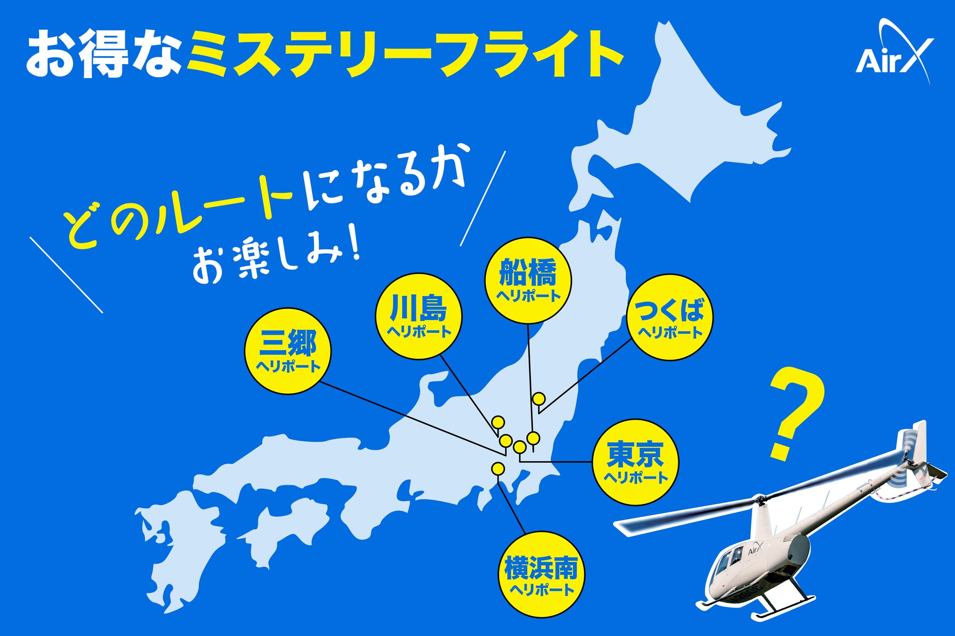 株式会社AirX(本社:東京都千代田区、代表取締役:手塚 究、以下「AirX」)は、ヘリコプターが税抜15,000円で乗れる「ミステリーフライト」の販売を開始することをお知らせいたします。