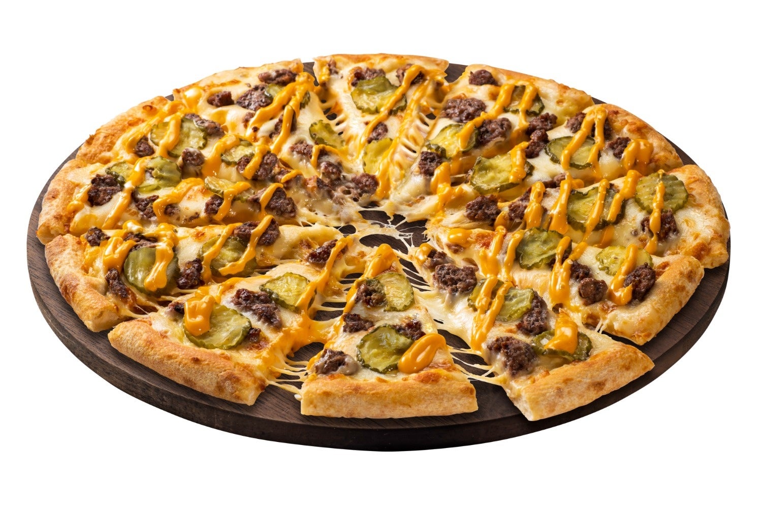 本場アメリカのバーガーの味わいを、ぜひこの1枚で!オーブンで焼いたピクルスの旨みがピザに染み込み、本格的なバーガーを堪能していただけます。パティの間からたっぷりチェダーチーズがあふれだすように仕立てました。さらに酸味と食感がアクセントのピクルス、燻された甘みを感じることができるベーコンと合わせることにより、本場、アリカのバーガー味を再現しました。
