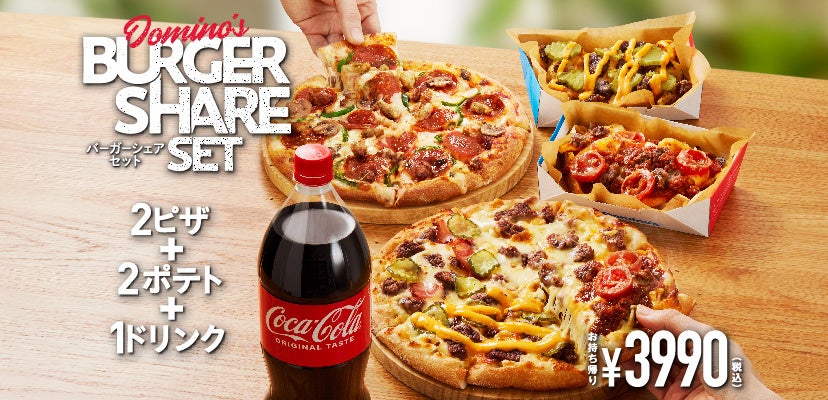 バーガーシェアセットでは、ママ友と過ごすランチやご家族で過ごすディナーにぴったりなメニューです。お好きなバーガーピザと、もう1枚お好きな1-2ハッピーピザ、バーガーポテト2品とコカ・コーラ1.5ℓがついて、なんと¥3,990円~。セット1つをご注文いただくだけで、食卓が豪華に彩られます。お召し上がりいただく人数やシチュエーションに合わせて、お好きなセットをお選びください。