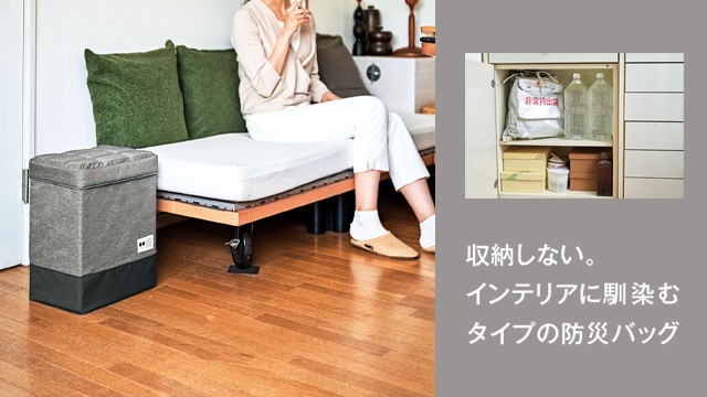 収納する事なくインテリアとして置いておく事ができる防災バッグ。
