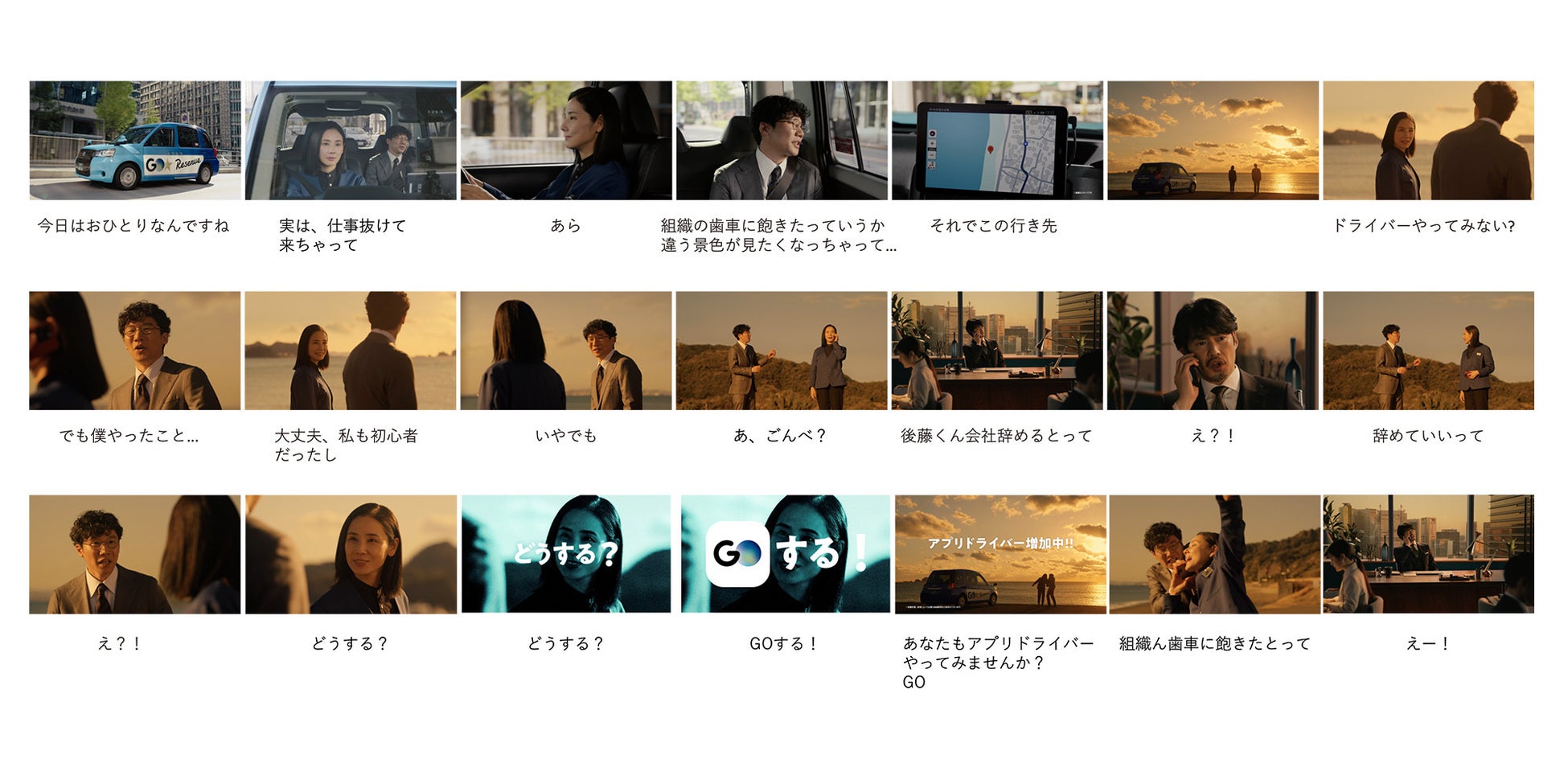 今回新たに公開となる「GOする!アプリドライバー 海へ篇」は、前作で“ごんべ”こと剛田部長と幼馴染で、『GO』からの注文のみを受けるアプリドライバーになっていたよっちゃんが、仕事を抜け出し「違う景色が見たくなっちゃって」と話す後藤くんを乗せて海へ向かいます。夕日を見て、たそがれている中、「ドライバーやってみない?」と、よっちゃんが問いかけると、戸惑う後藤くんそっちのけで、おもむろに剛田部長へ電話をかけ「後藤くん会社辞めるとって」と伝えてしまいます。よっちゃんの軽妙なトークにタジタジになる二人と、よっちゃんからの「どうする?」は必見です。