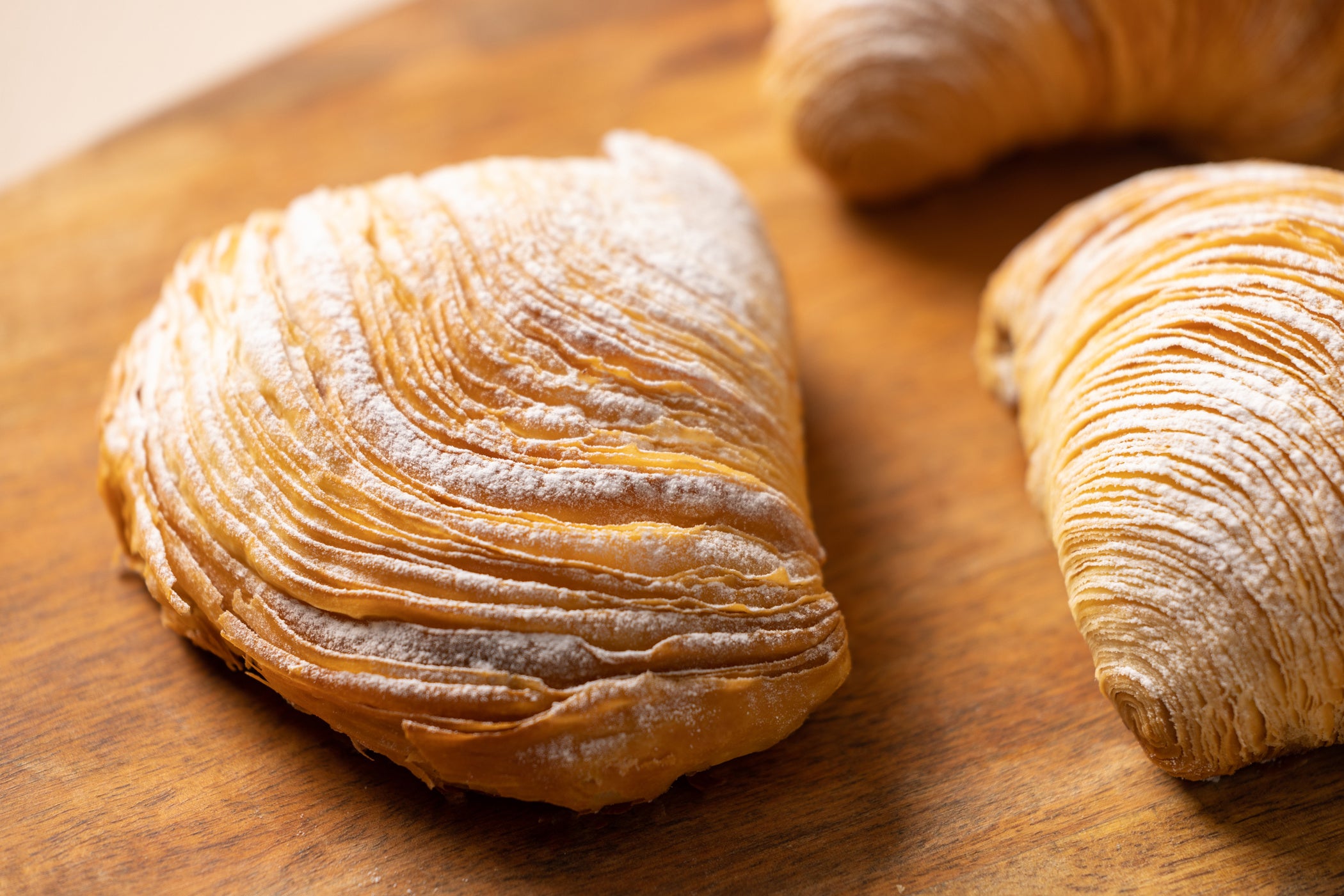 貝のような美しい見た目で、「ひだを何枚も重ねた」という意味の「スフォリアテッレ」は、イタリア・ナポリ地方発祥の焼き菓子です。薄く重なり合ったパイの層が特徴の生地の中には、リコッタチーズとアーモンドクリーム、キャラメルでソテーした角切りの洋梨を合わせたまろやかな甘さのフィリングを詰めます。軽快な歯ざわりと洋梨が香るなめらかなクリームの絶妙なハーモニーをお楽しみください。