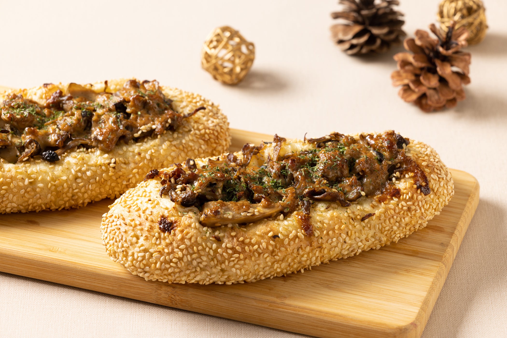 パスタに使われることが多いセモリナ粉を混ぜ込み、もっちりとした食感に仕上げるフォカッチャに、ごま油でソテーしたエリンギや舞茸、しめじ、ベーコンをトッピング。さらに、煎りごまをたっぷりとまぶし、ごまマヨネーズソースをかけて焼き上げました。食欲をそそるごまの香りが広がり、きのこの旨味がお楽しみいただける、秋ならではのブレッドです。