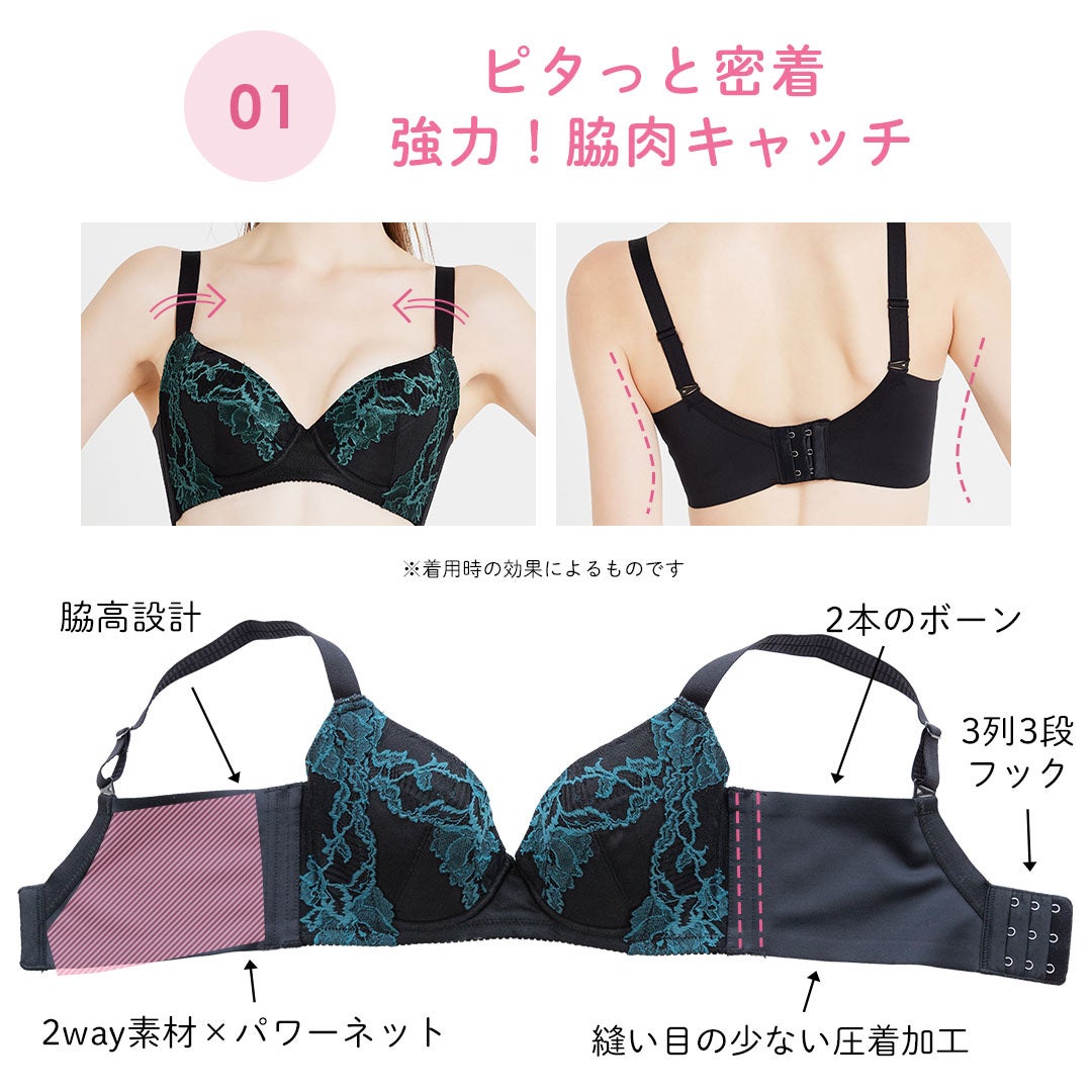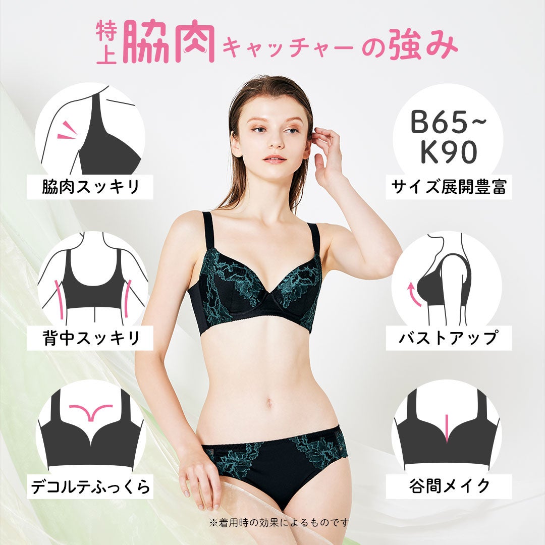 「脇肉キャッチャー®」シリーズは加齢や授乳後などで体形崩れに悩む女性を中心に人気となっている、累計販売本数75万枚超えのロングセラーを誇る機能性ブラジャー。なかでも柔らかく滑らかな肌触りと気持ちいい着け心地の「特上脇肉キャッチャー」。そのポイントは以下の5点となります。