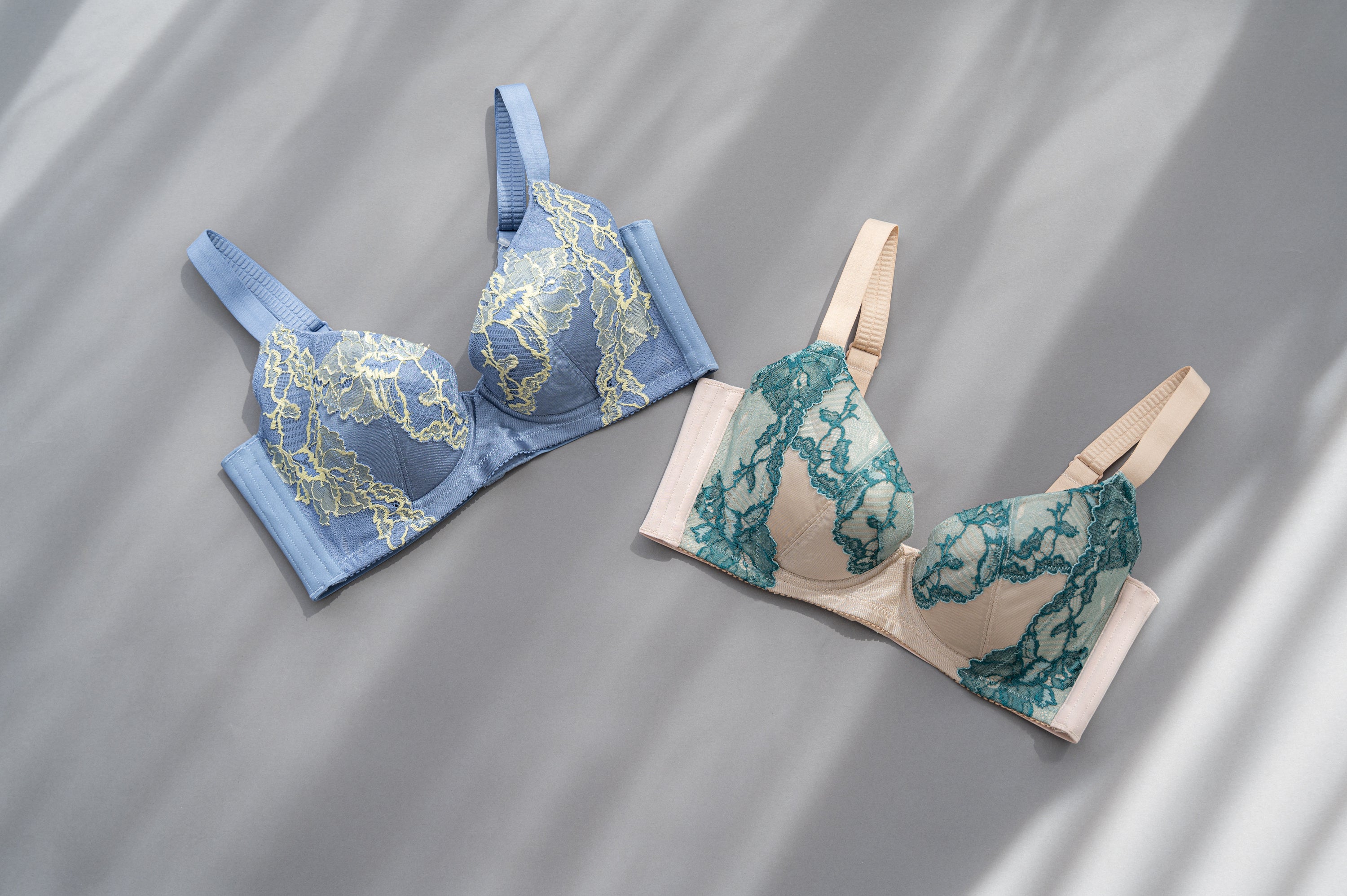 ヌーディーカラーに深みのあるグリーンのレースがかっこいい印象のヘーゼルとくすみブルーに淡い黄色のレースで大人かわいいブルーの2色です。どちらも落ち着きのあるカラーリングとなっています。これからの季節も下着からファッションを楽しんでください。