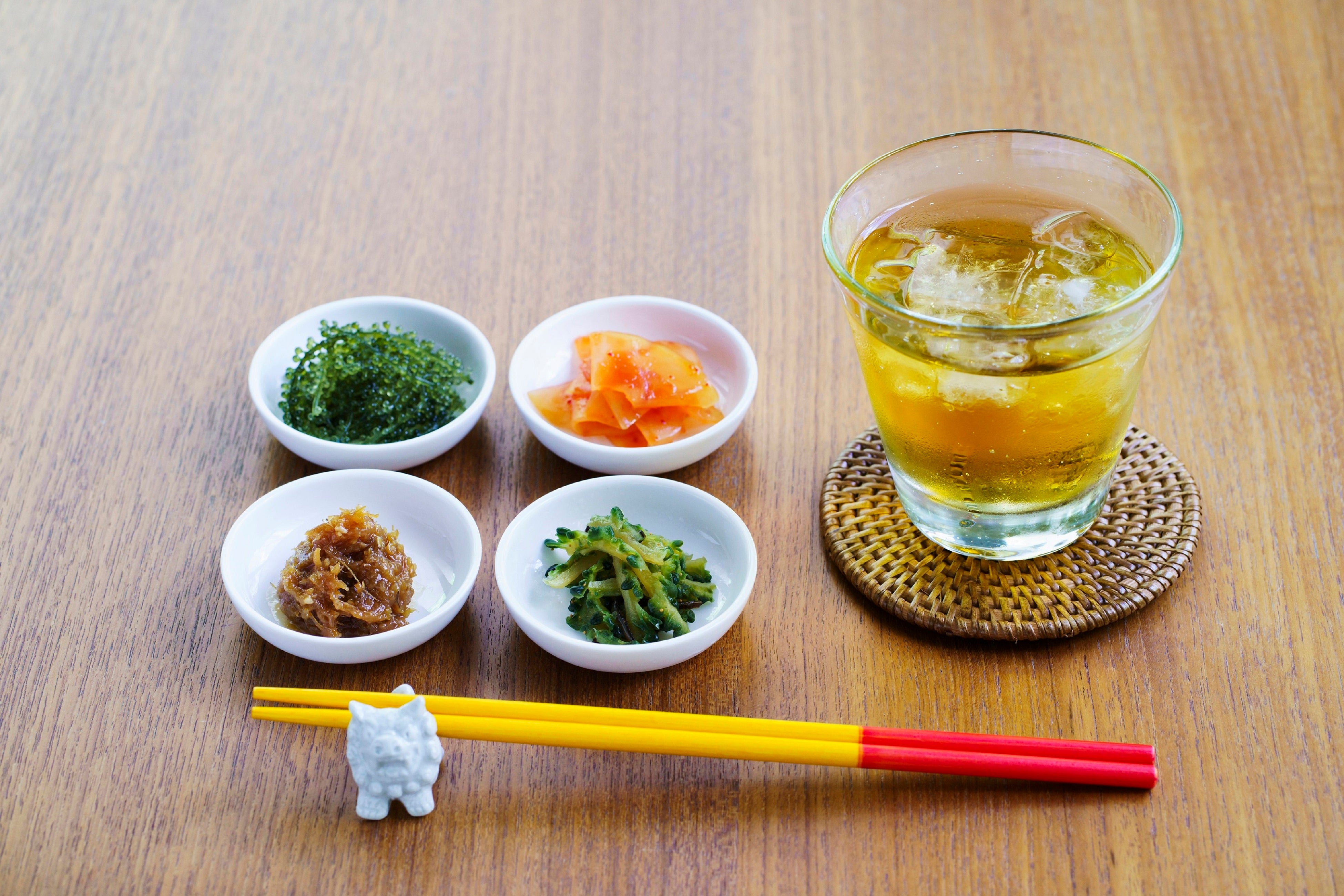 出発前に、館内で写真パネルを使って市場で出会える店主の皆さんを予習します。お供にゴーヤーの漬物や海ぶどうなど、その日のオススメ3種をさんぴん茶と合わせて用意。見慣れない食材については、その場でOMOレンジャーに質問をしても良し、市場へ行って店主に直接聞いても良し。見て、食べて、想像して、出発前に楽しい支度の時間です。