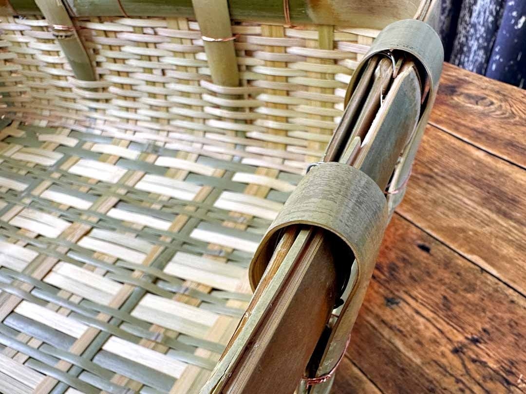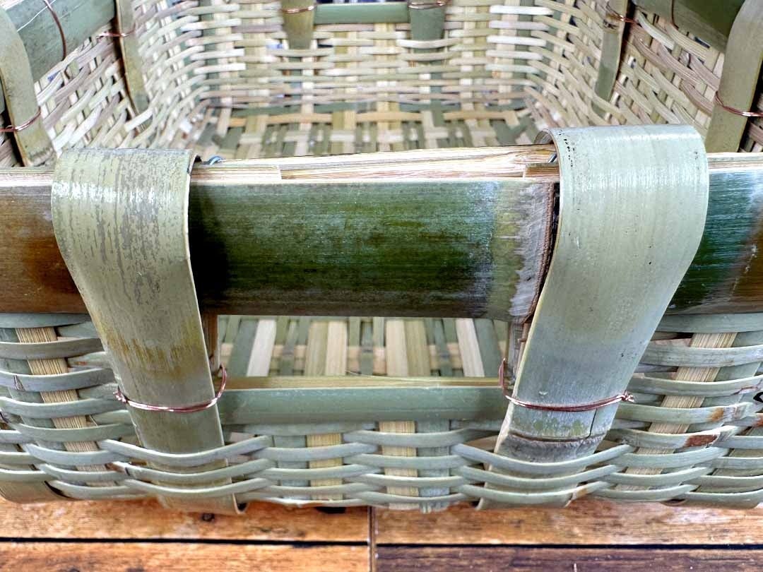 太く強靭な「力竹(ちからだけ)」を誂え、底面をしっかり補強してあるため、重量のある物を入れても歪みにくくなっています。しっかりとした枠組みと落ち着いた色合い、そして自然なツヤ感が空間に温かみを加え、和洋問わず様々なインテリアに調和します。使い込むことで手に馴染み、暮らしの中にしっかりと根を下ろしていく、そんな逸品です。