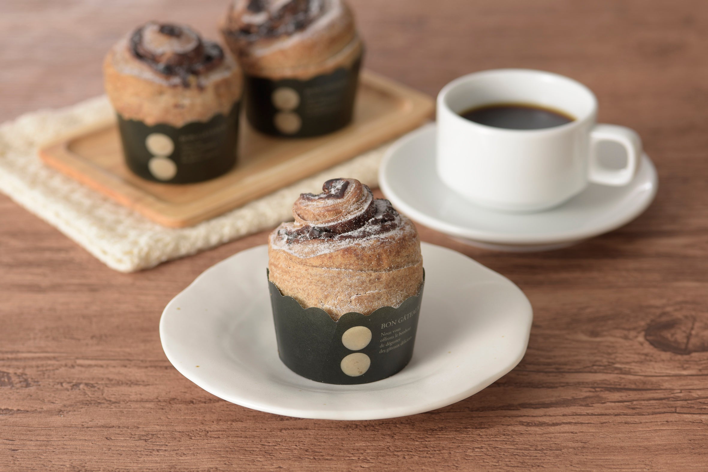 144層のクロワッサン生地の間にチョコクリームとココアビスケットを合わせ、マフィンの型に入れ焼き上げました。チョコ風味のクロワッサン生地と中にある粒状のココアビスケットが楽しめるクロワッサンマフィンです。