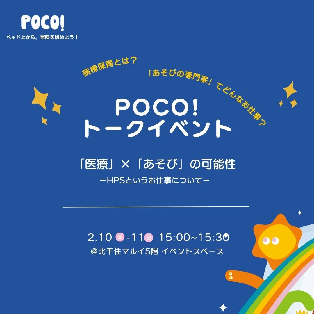 一般社団法人Child Play Lab. (所在地:東京都渋谷区、代表理事:猪村真由) は、2024年2月に入院という時間をちょっと特別にするブランド「POCO!」をリリースしました。ローンチ記念に、北千住マルイ5Fで2月10日〜11日にPOP-UP STOREを開催します。イベント当日は、独自に開発したオリジナル絵本作成キットを使い、こどもたちを対象とした創造ワークショップ、「医療」×「あそび」の可能性についてのトークイベントを開催します。