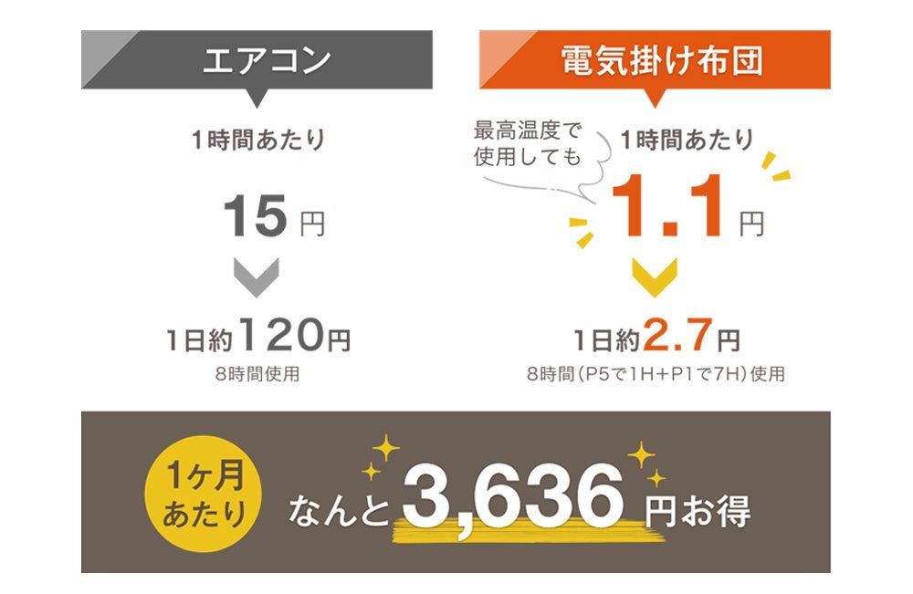 一般的にエアコンを1時間使用した場合、平均約15円となっており1日8時間使用すると電気掛け布団との電気代の差は1か月で3000円以上にも及びます。