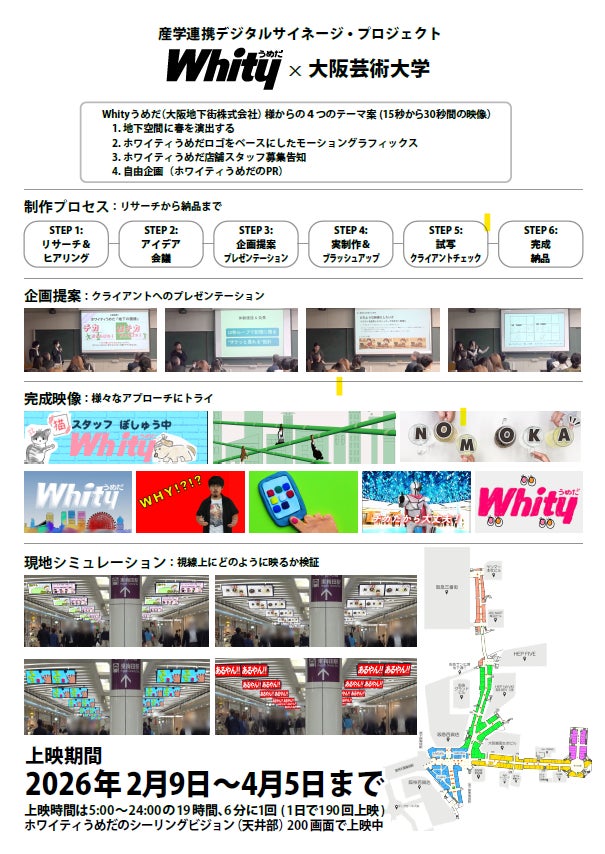 大阪芸術大学(所在地:大阪府南河内郡、学⾧:塚本 邦彦、以下本学)は、大阪地下街株式会社と協働し、1日約40万人が通行する「ホワイティうめだ」の200面デジタルサイネージを活用したPR映像制作プロジェクトを実施しました。本プロジェクトは、映像学科の学生たちが「リアルなクライアントワーク」を体験する実践的な取り組みであり、制作された16チームの映像作品は、ホワイティうめだにて2026年4月5日(日)まで放映しています。