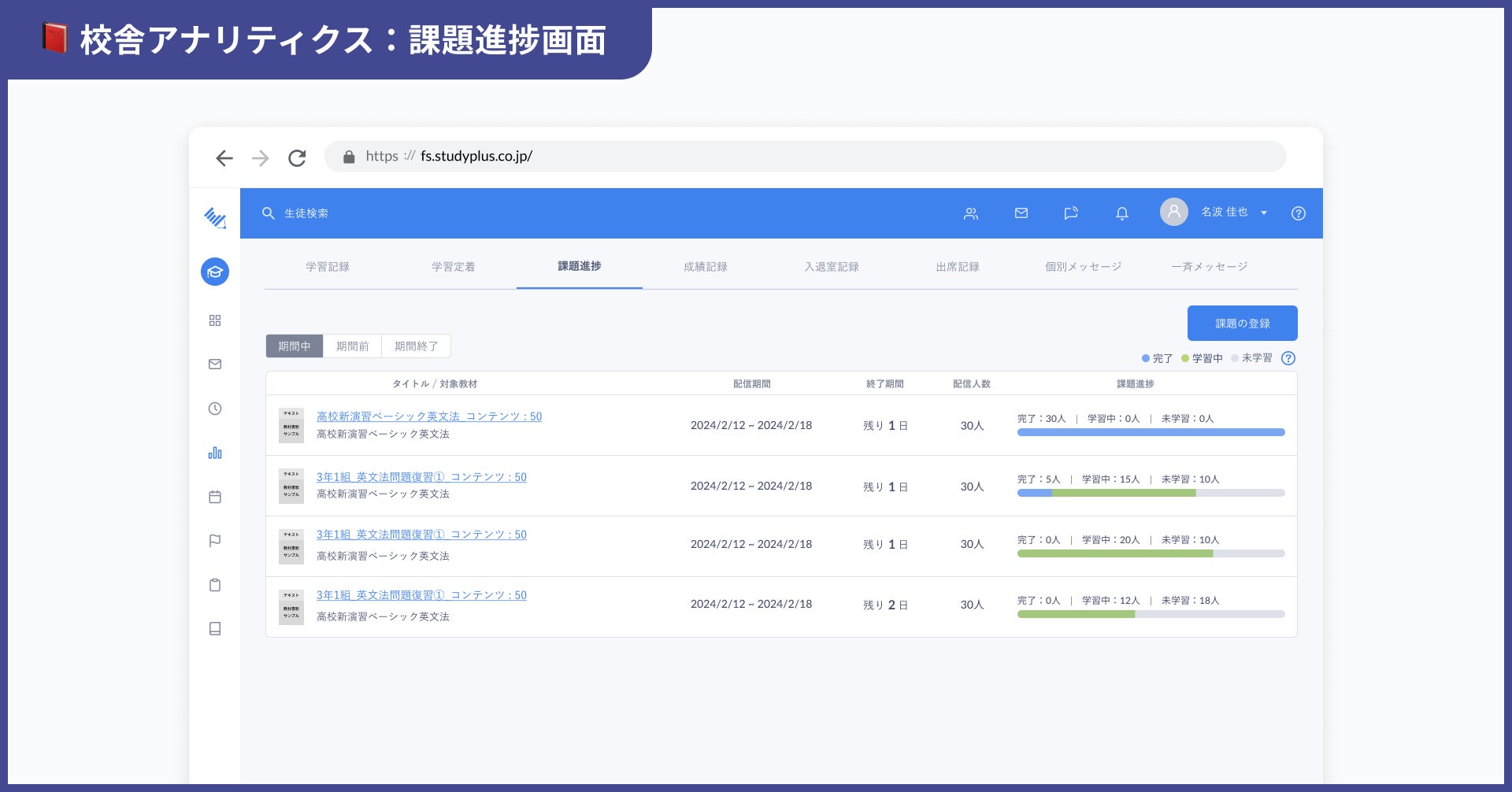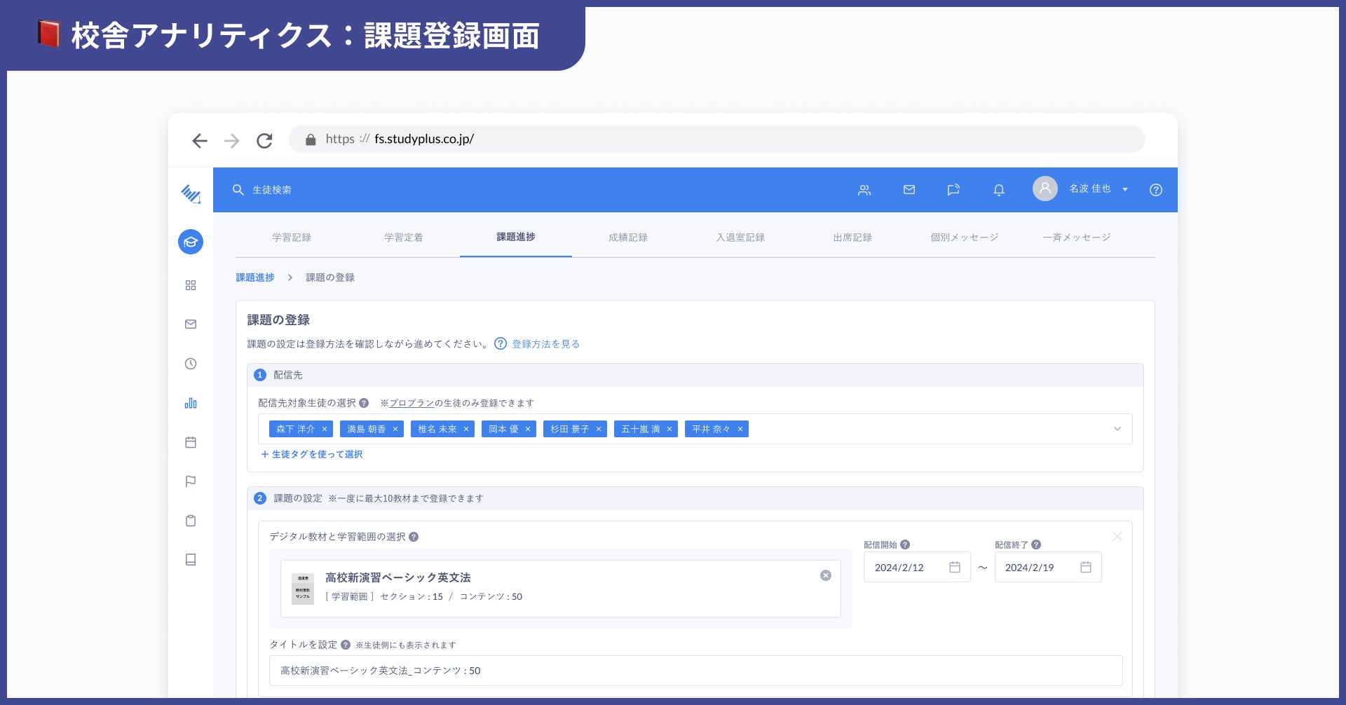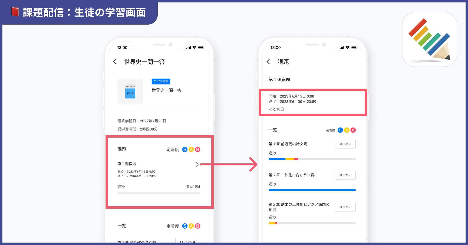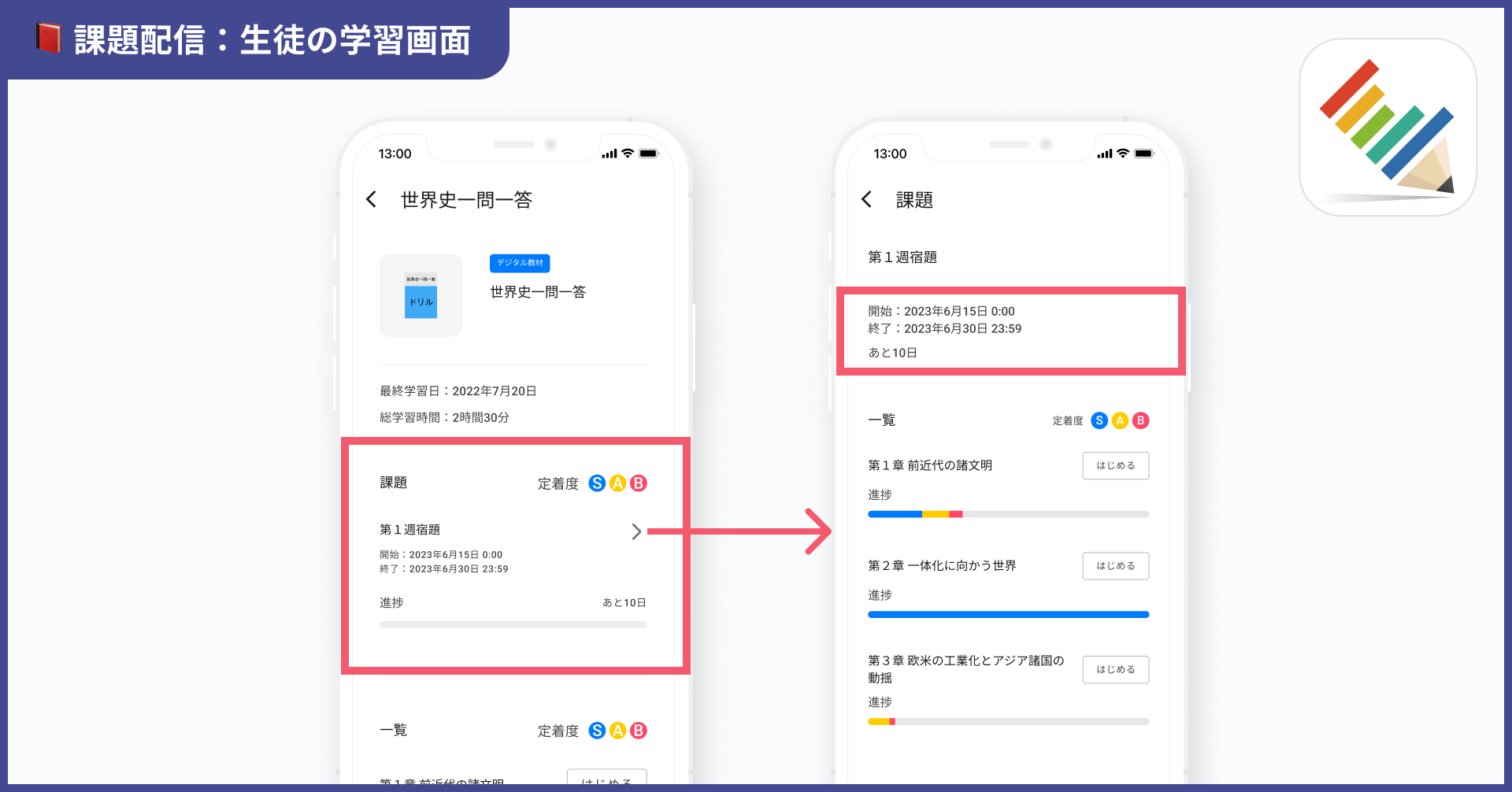 今回リリースした「課題配信機能」によって、先生が「Studyplus for School」上で生徒にデジタル教材を配信する際に、新たに学習範囲と期日を設定して、宿題として配信することができるようになりました。先生は、生徒の宿題の学習進捗・理解度をリアルタイムに確認することができます。