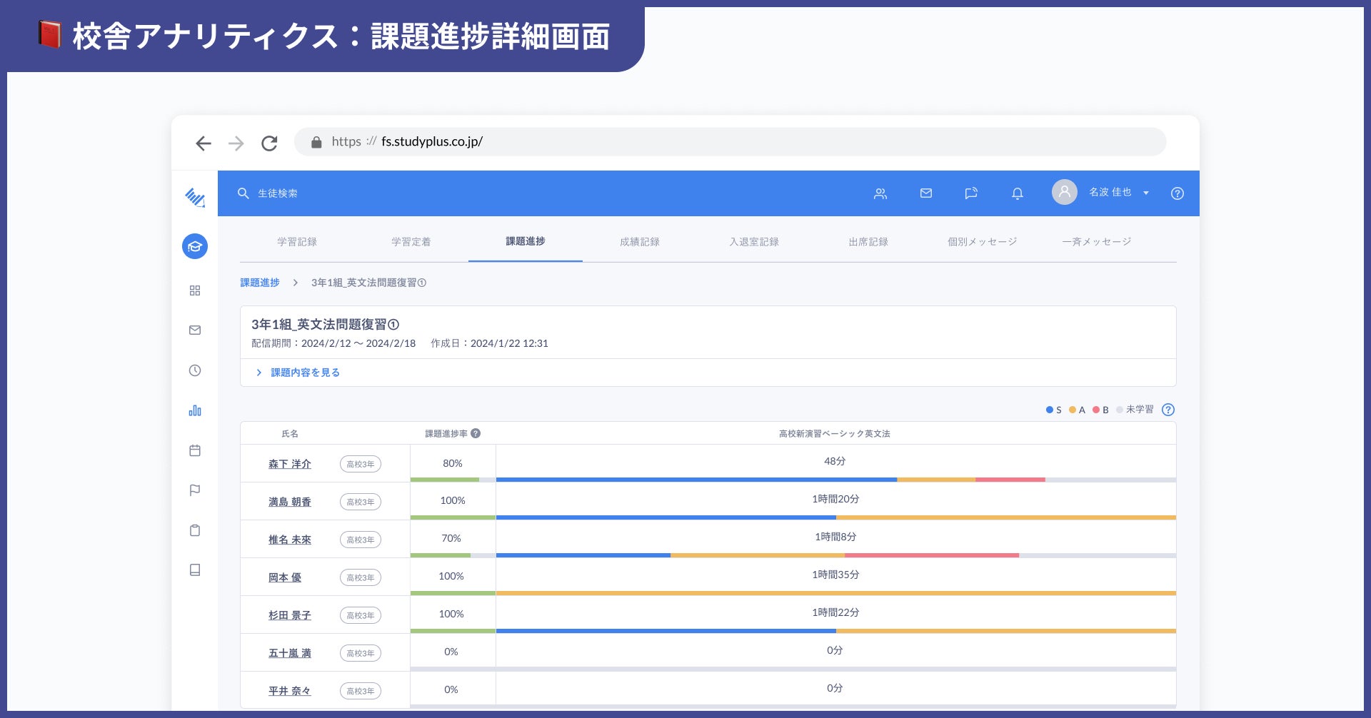 配信日からリアルタイムで、生徒の宿題の進捗・理解度を確認することができます。予定通りに進んでいない生徒や、理解度が低いまま進んでいる生徒を素早く把握し、一人一人に細かいフォローを行うことができます。