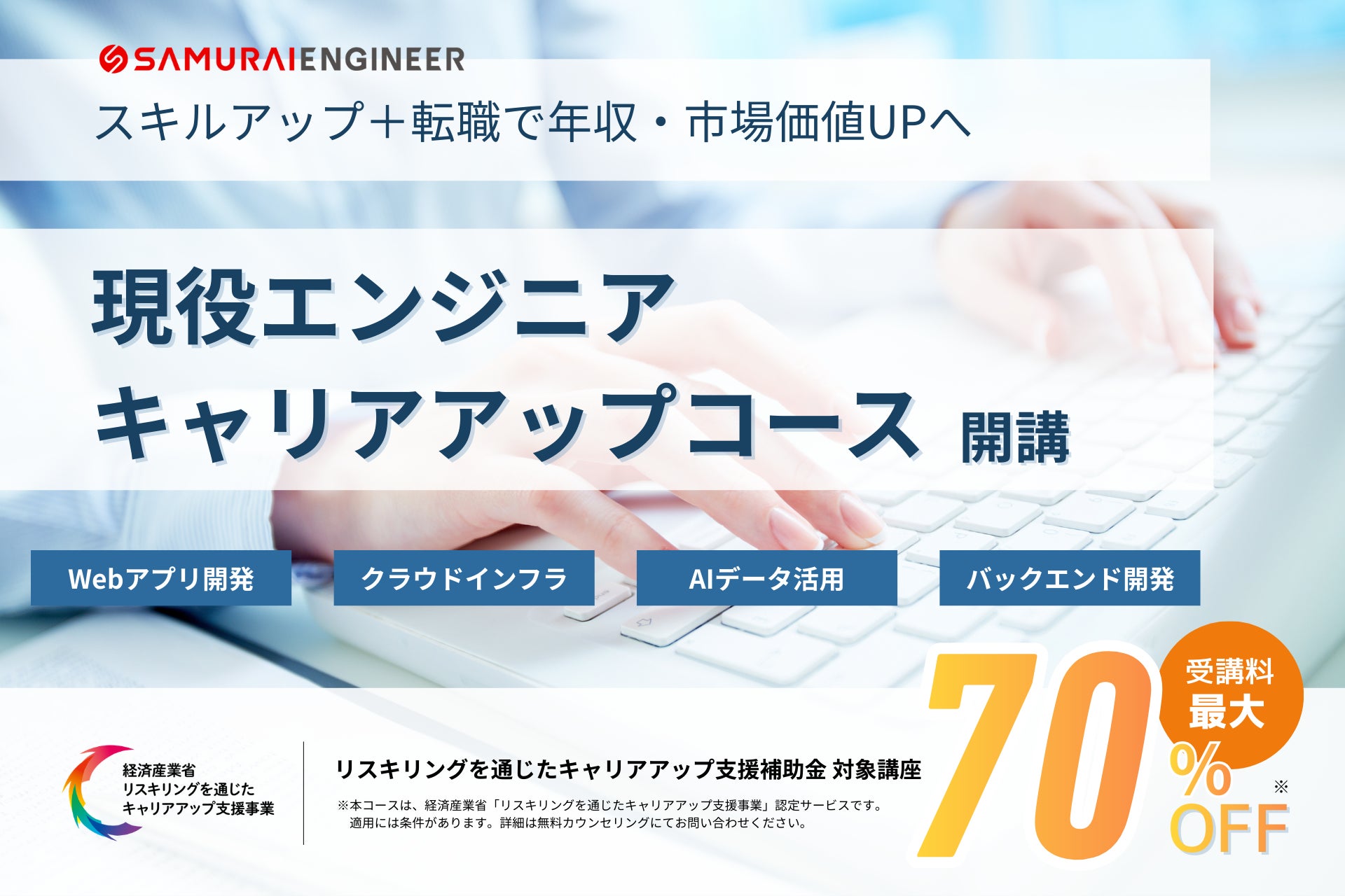 株式会社SAMURAI(本社:東京都港区、代表取締役:羽田 吾立)は、運営するプログラミングスクール「侍エンジニア」内に、現役エンジニア向け短期集中型リスキリングプログラム「現役エンジニアキャリアアップコース」を開講しました。