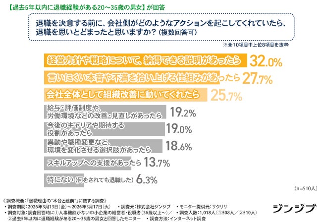 当社で実施したアンケート調査(※3)では、過去に中小企業を退職した20~35才の元若手エース社員(※4)の63.9%が「本音を伝えた」と回答し、また94%が「会社の対応があれば思いとどまった」と回答しています。