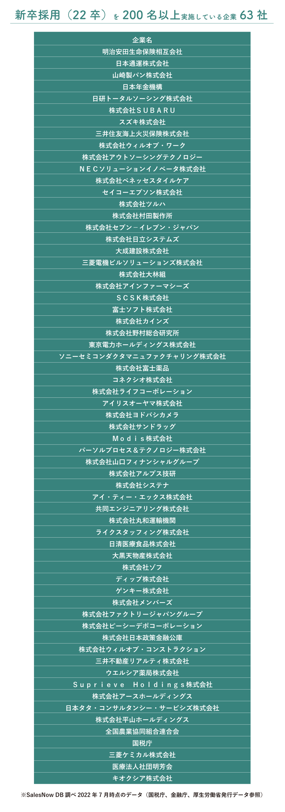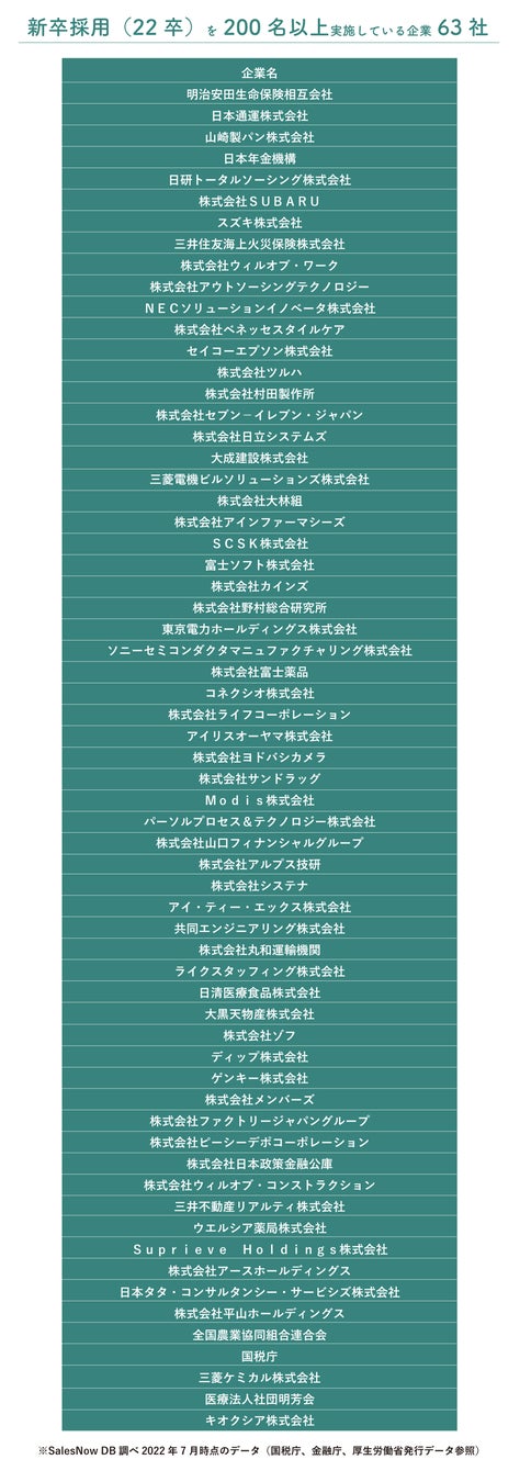 - 「新卒採用(2022年卒)を200名以上実施している企業63社」について