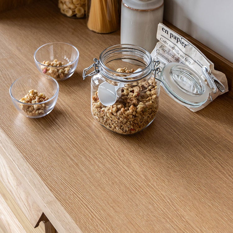 シトラスIIシリーズの特長は、何と言ってもオーク材の美しい木目とホワイトのバックパネルを組み合わせた、明るさと木の温もりを感じるデザイン。ホワイトを組み合わせることで、ナチュラルだけでなくモダンで洗練された雰囲気も演出します。取っ手部分は天然木のパーツを採用するなど細部までこだわり、木の優しい質感を感じられるように仕上げました。