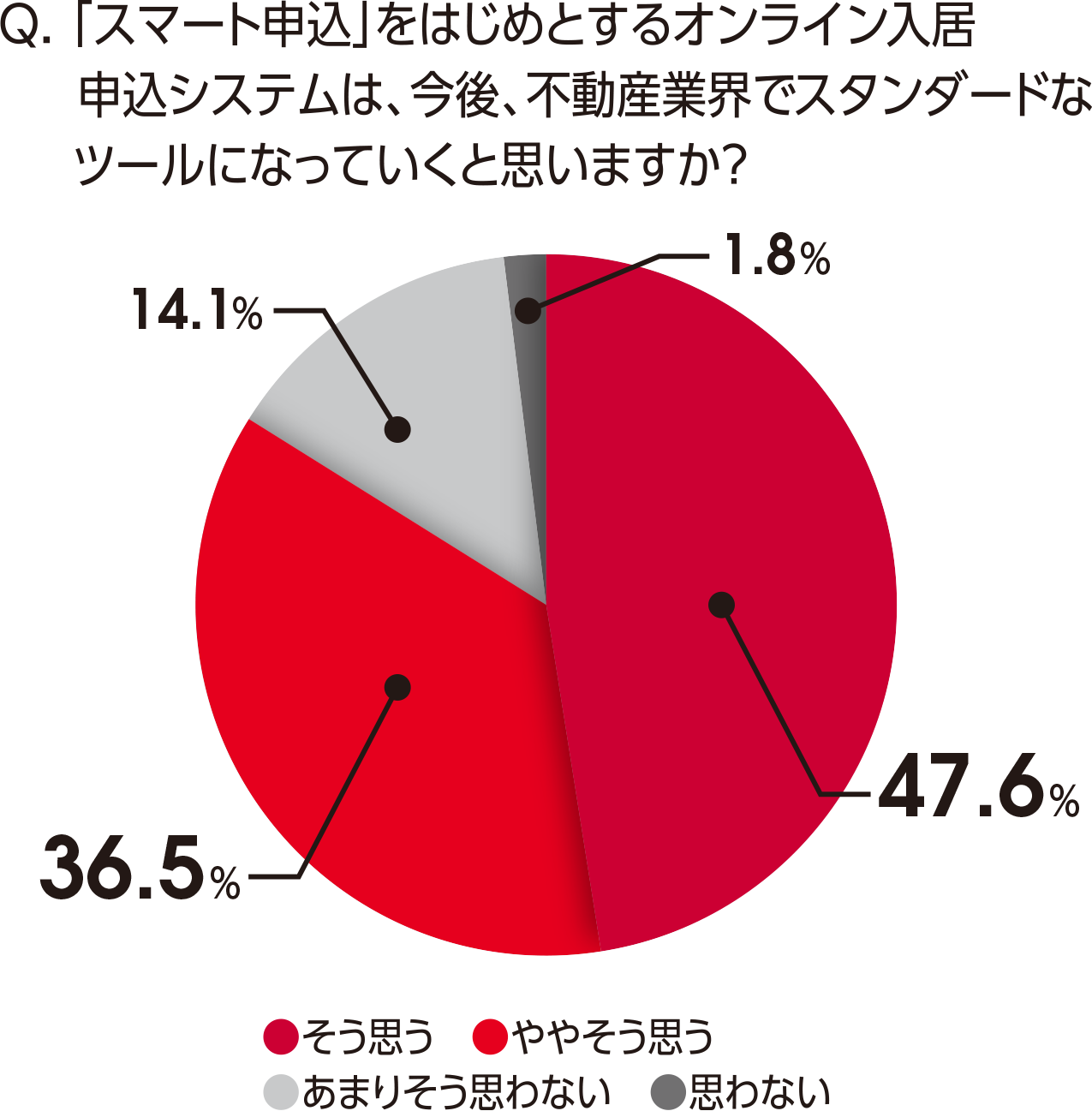 契約加盟店を対象に行ったアンケートによると、「電話・FAXでの受付が減った」や「紙での運用が減りデータの管理が楽になった」、「お客さまの申込書の不備が減った」など業務課題解決に役立ったという声が寄せられました。さらに『「スマート申込」をはじめとするオンライン入居申込システムは、今後、不動産業界でスタンダードなツールになっていくと思いますか?』という問いに対しては84.1%もの方が「そう思う」「ややそう思う」と回答し、今後の入居申込みに関するオンライン化は加速すると考えているようです。