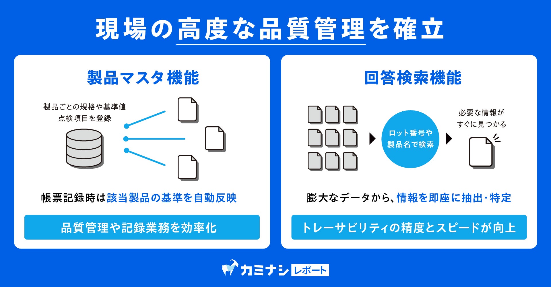 こうした課題を解決すべく、『カミナシ レポート』では新たに「製品マスタ機能」と「回答検索機能」を開発しました。本機能を通じて、現場の高度な品質管理の実現に貢献します。