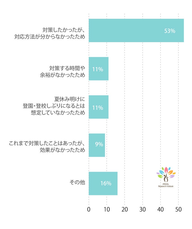 53%の保護者が、登園・登校しぶりに対応したいけれど対策方法が分からない、また9%の保護者が今まで行った対策では効果がないと回答されています。