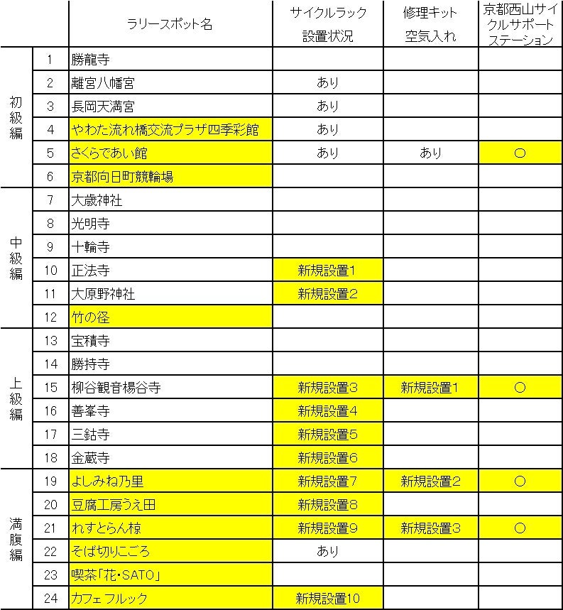 また、ラリースポットのうち、サイクルラックの設置に加え、空気入れや修理キットの貸出サービスが可能なスポット4箇所(さくらであい館、柳谷観音 楊谷寺、れすとらん椋、よしみね乃里)を「京都西山サイクルサポートステーション」として位置付け、サイクリストに対し、広く周知するとともに、引き続き、サイクリストの受入環境整備を進めてまいります。