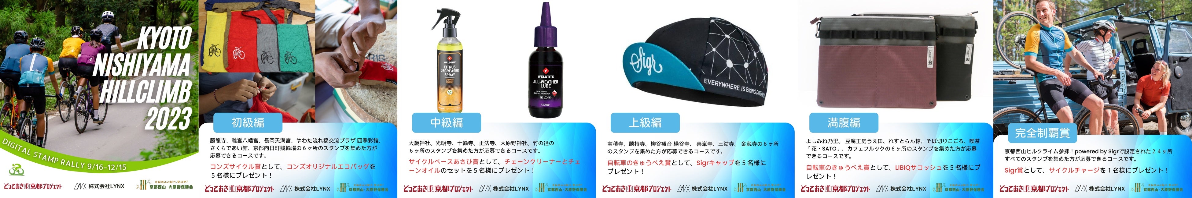 この度、両プロジェクトの対象エリア内である京都西山エリア(京都市西京区、向日市、長岡京市、大山崎町)を舞台に、京都西山・大原野保勝会及び株式会社LYNXが周辺自治体等と連携し、3つのサイクリングイベントからなる「京都西山ヒルクライム参拝!powered by Sigr」を開催しますので、お知らせします。