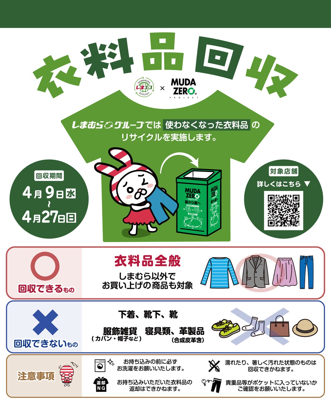 また 4/ 9(水)から 4/27(日)まで、衣料品回収をしまむらグループ400店舗で実施します。